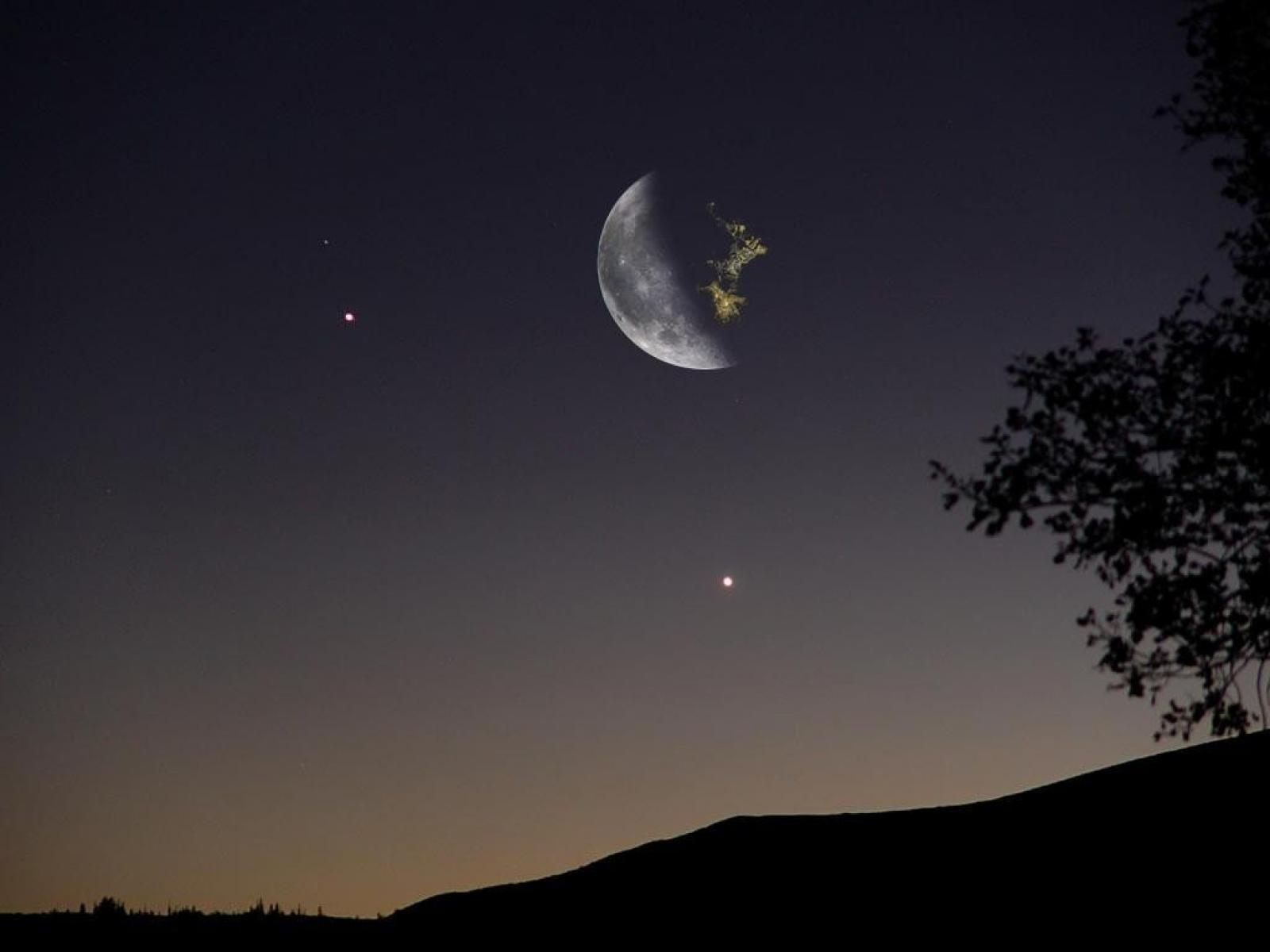 Description: A crescent moon and a star in the sky at night time with a tree in the foreground and a distant moon in the distance.