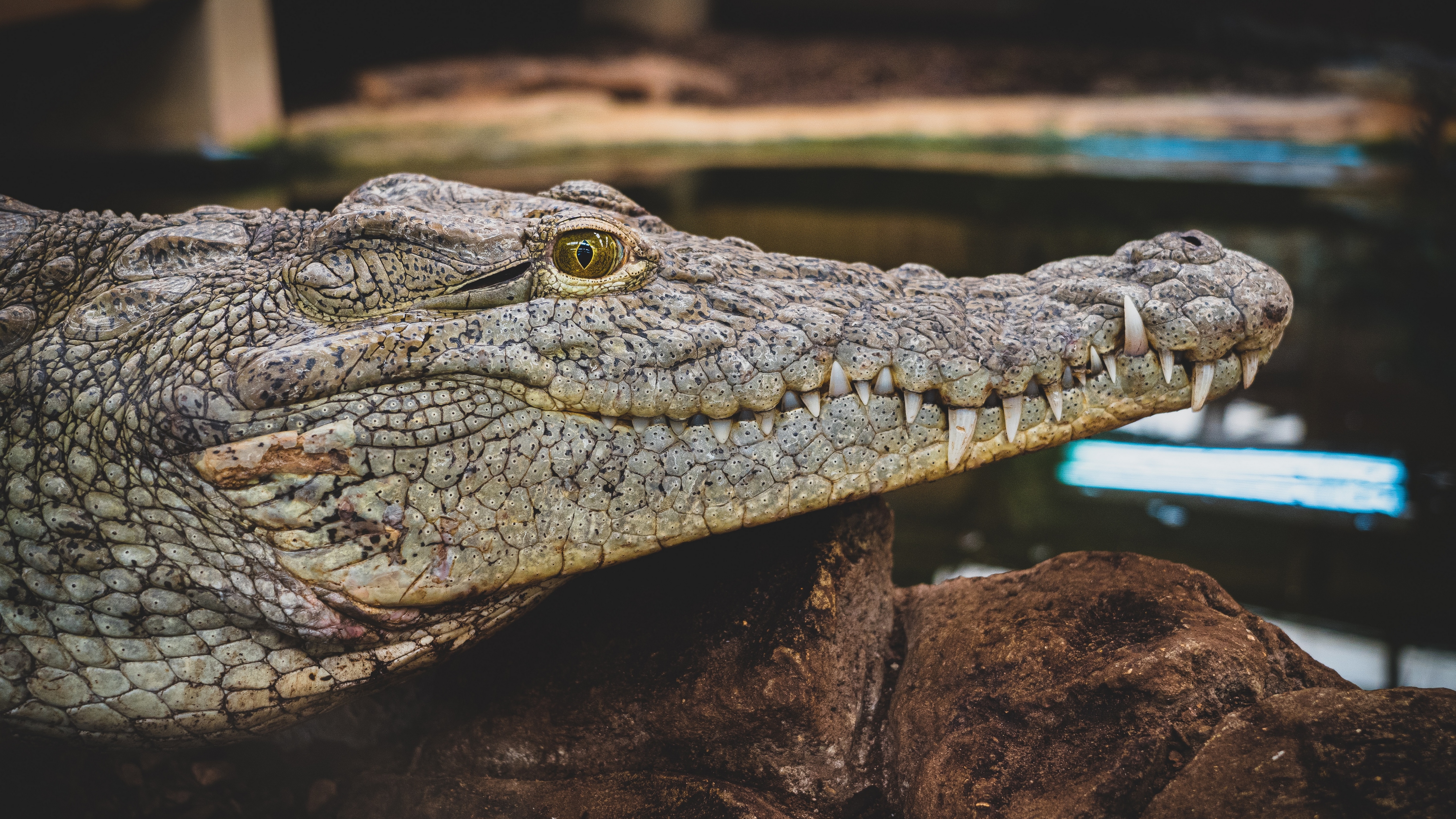 Description: A close up of a crocodile's head with a blurry background of water and rocks in the foreground.