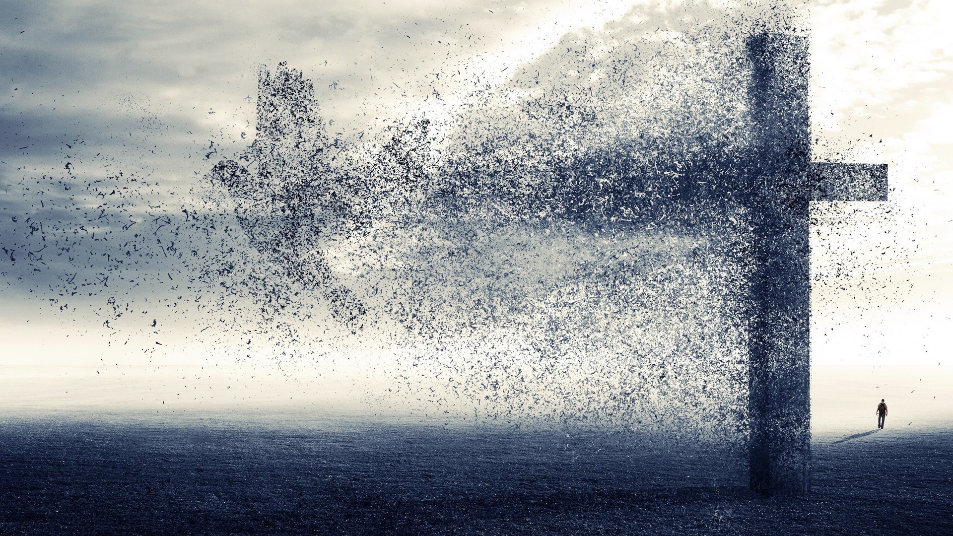 Description: A cross in the middle of a field with a person standing in the distance in the distance.