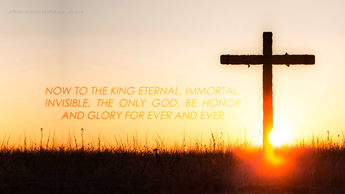 Description: A cross in the middle of a field with a sunset behind it and a quote from the bible on it.