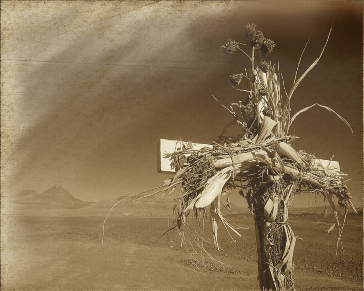 Description: A cross with a bunch of vines on it in the desert with a mountain in the background and a sunbeam in the foreground.