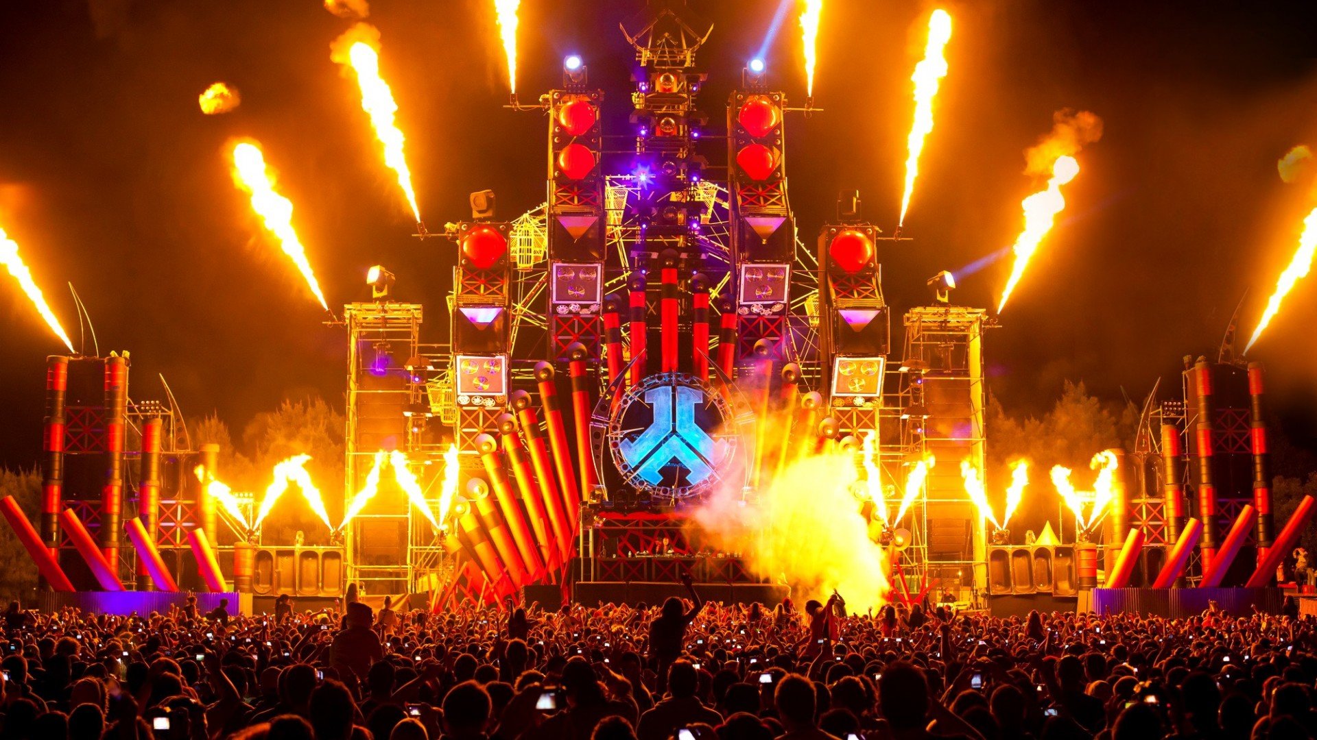 Description: A large crowd of people watching a stage with a large display of lights and fireworks on it's side.