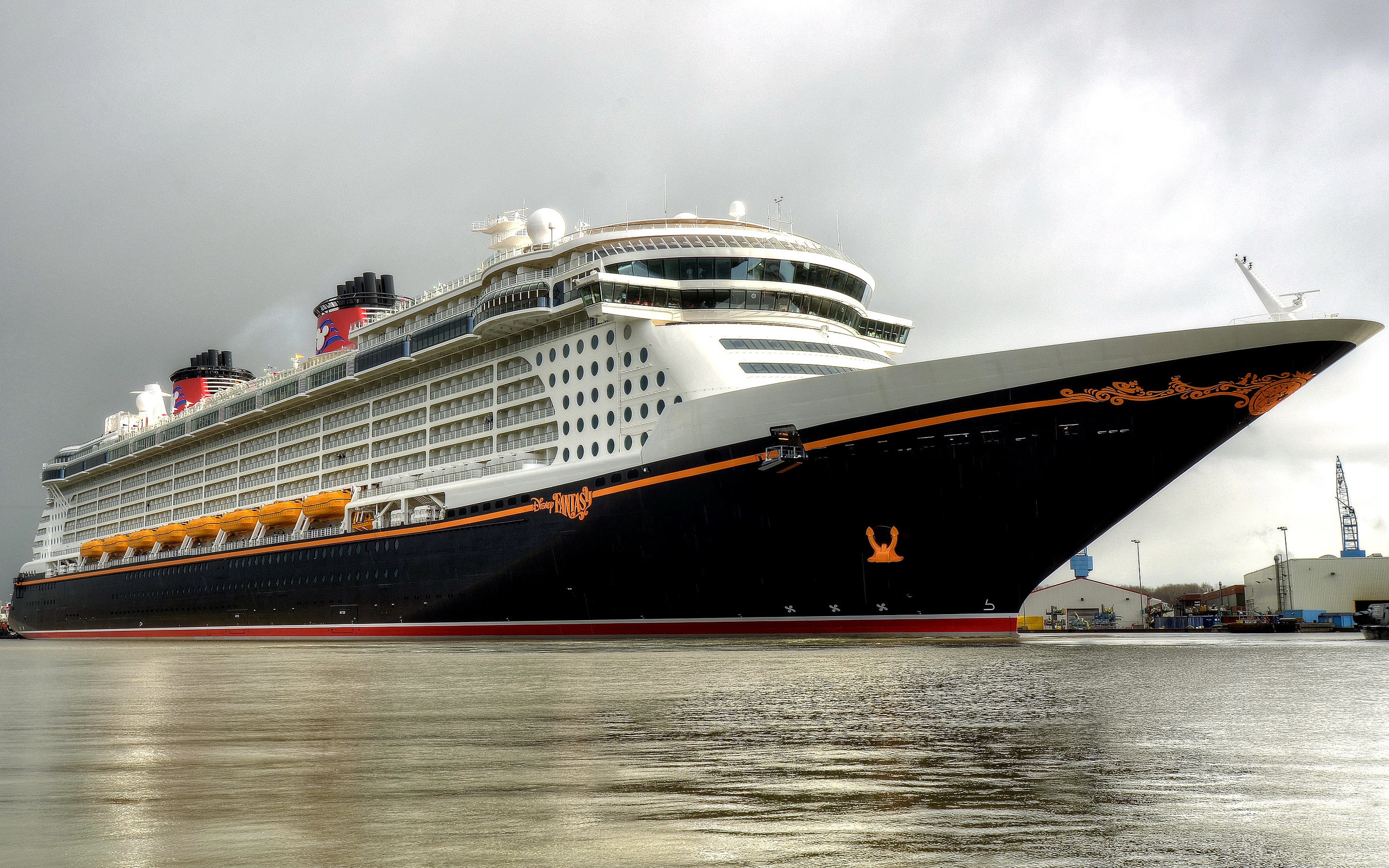Description: A large cruise ship docked at a dock with a cloudy sky in the background and a person standing on the dock.