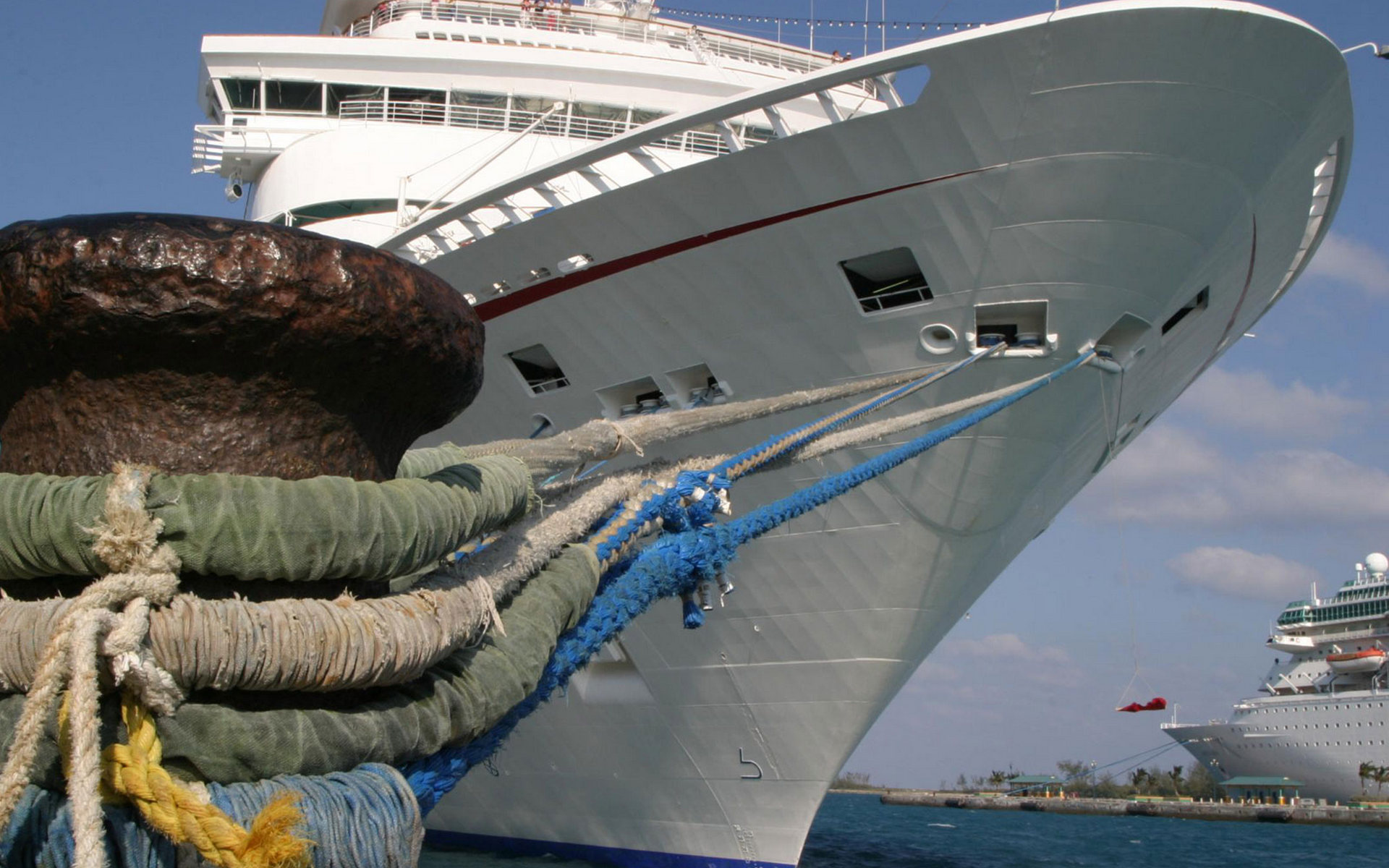 Description: A large cruise ship docked in a harbor with ropes and ropes around it's hulls and a roped up buoy.