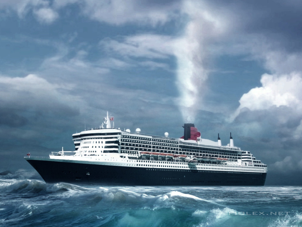 Description: A cruise ship in the ocean with a cloud formation in the sky above it and a rainbow in the sky.