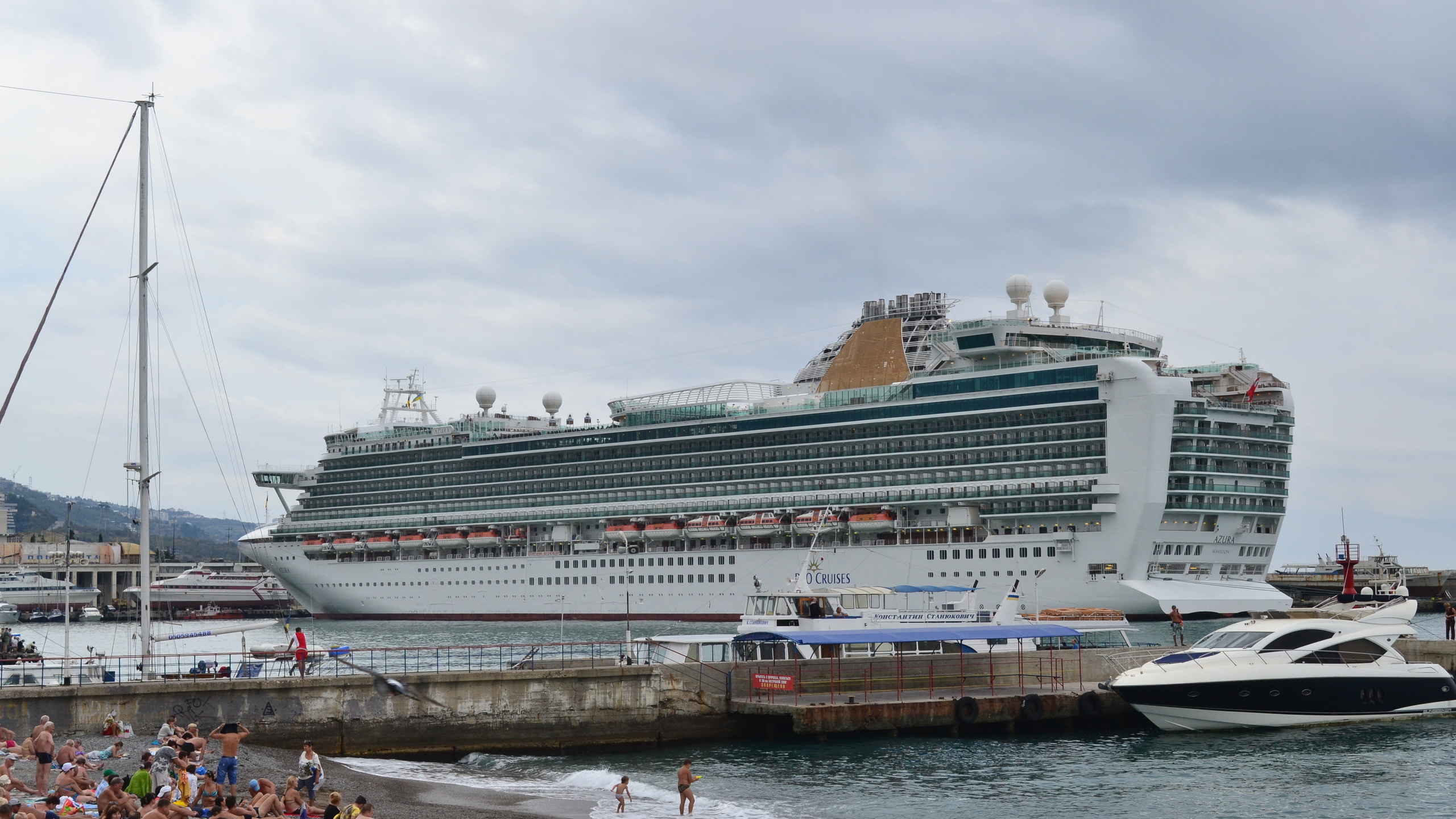 Description: A large cruise ship docked at a pier with a crowd of people watching it from the water's edge.