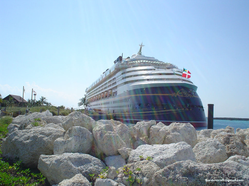Description: A cruise ship docked at a rocky shore with rocks and grass around it and a blue sky in the background.