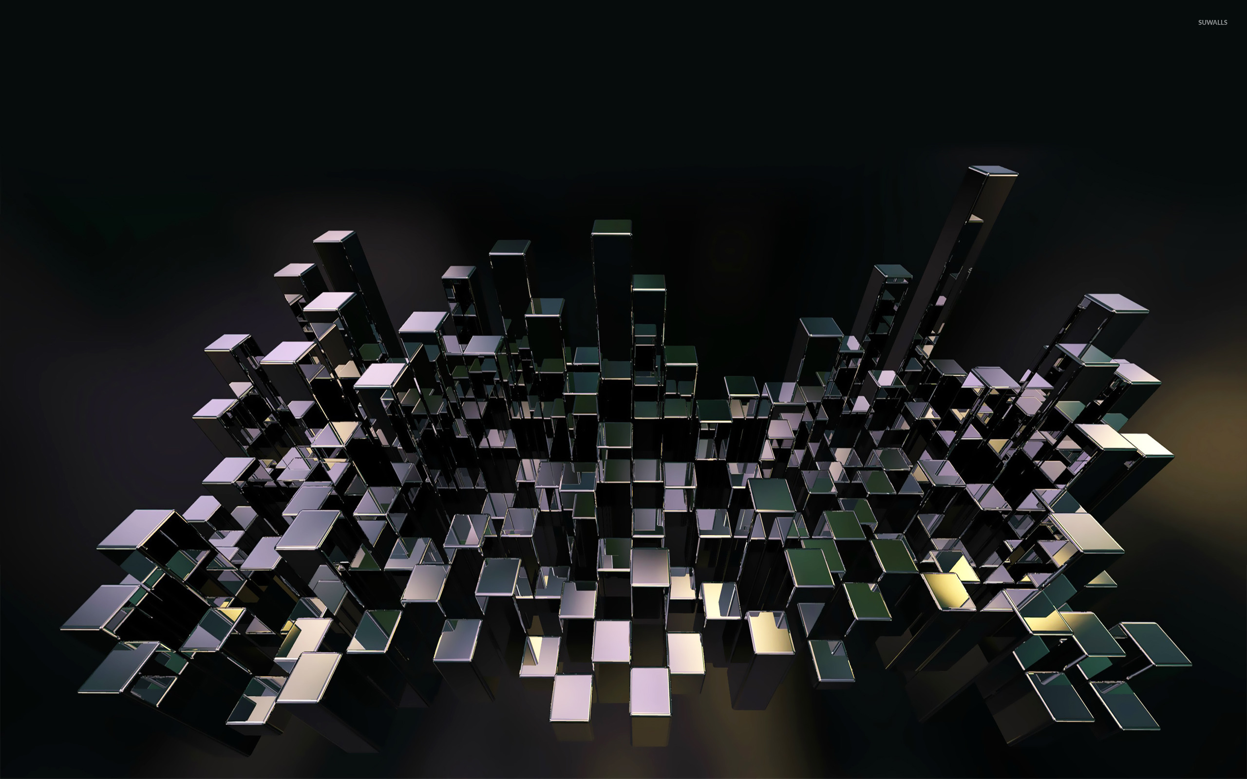 Description: A black and white photo of a bunch of cubes in the air with a black background and a black background.