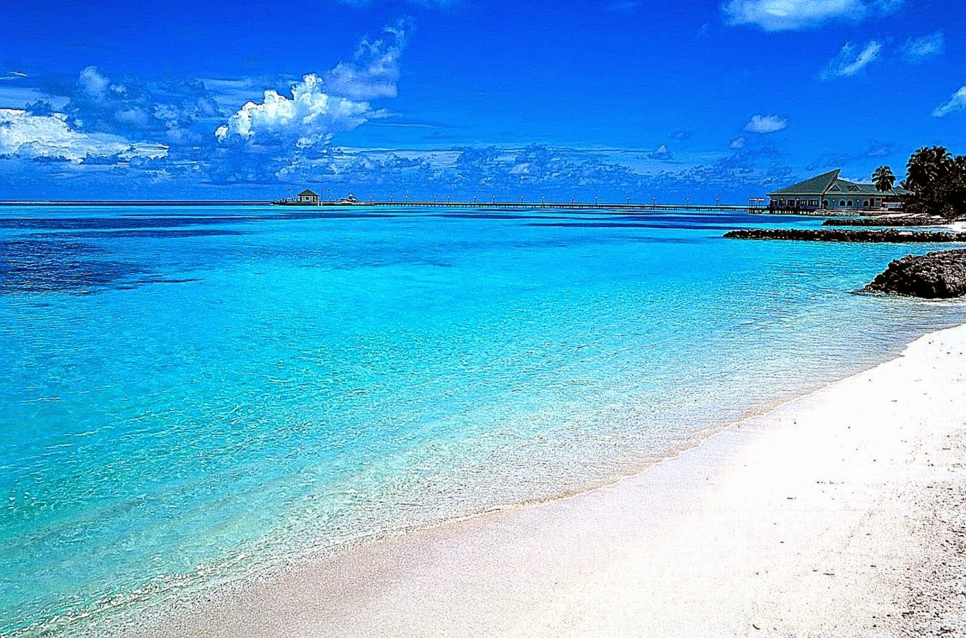Description: A beach with clear blue water and a white sand beach with a house in the distance and a blue sky.