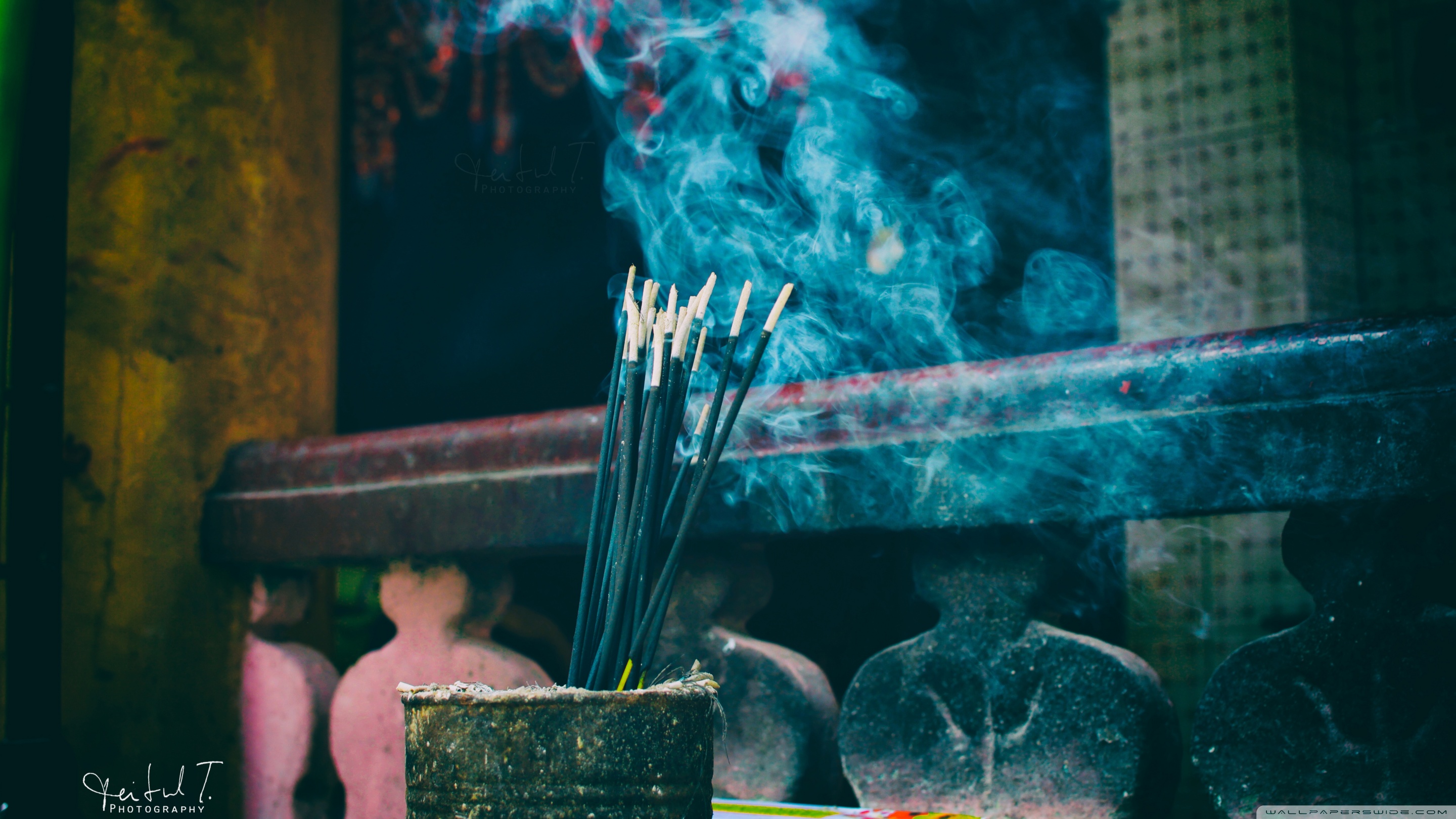 Description: A cup with incense sticks in it sitting on a table next to a statue of a woman and a man.