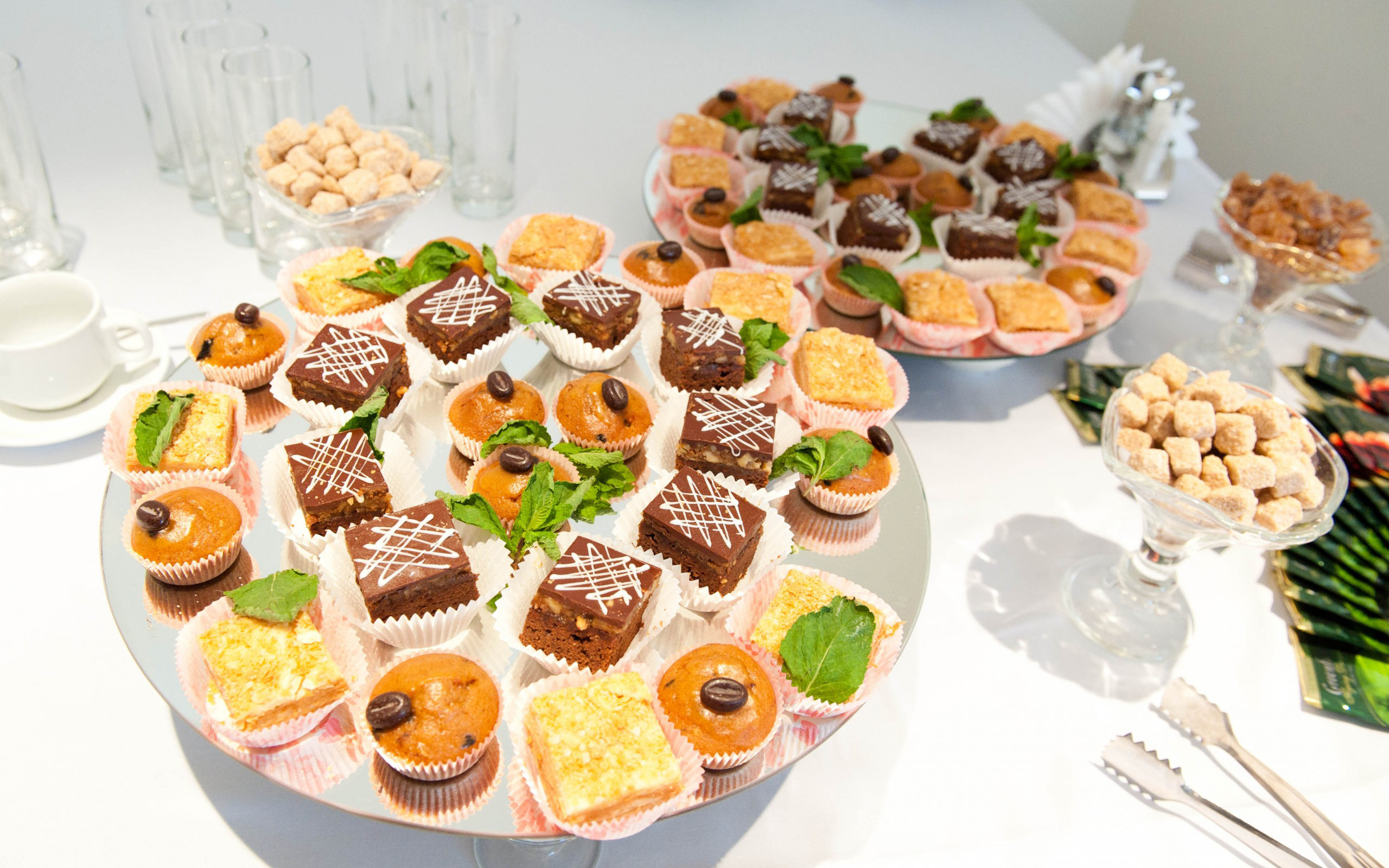Description: A table with a plate of cupcakes and a platter of cookies and other desserts on it.