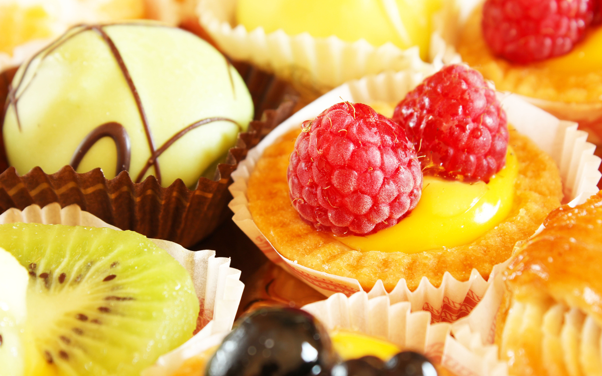 Description: A close up of a bunch of cupcakes with fruit on top of them and chocolate on the side.