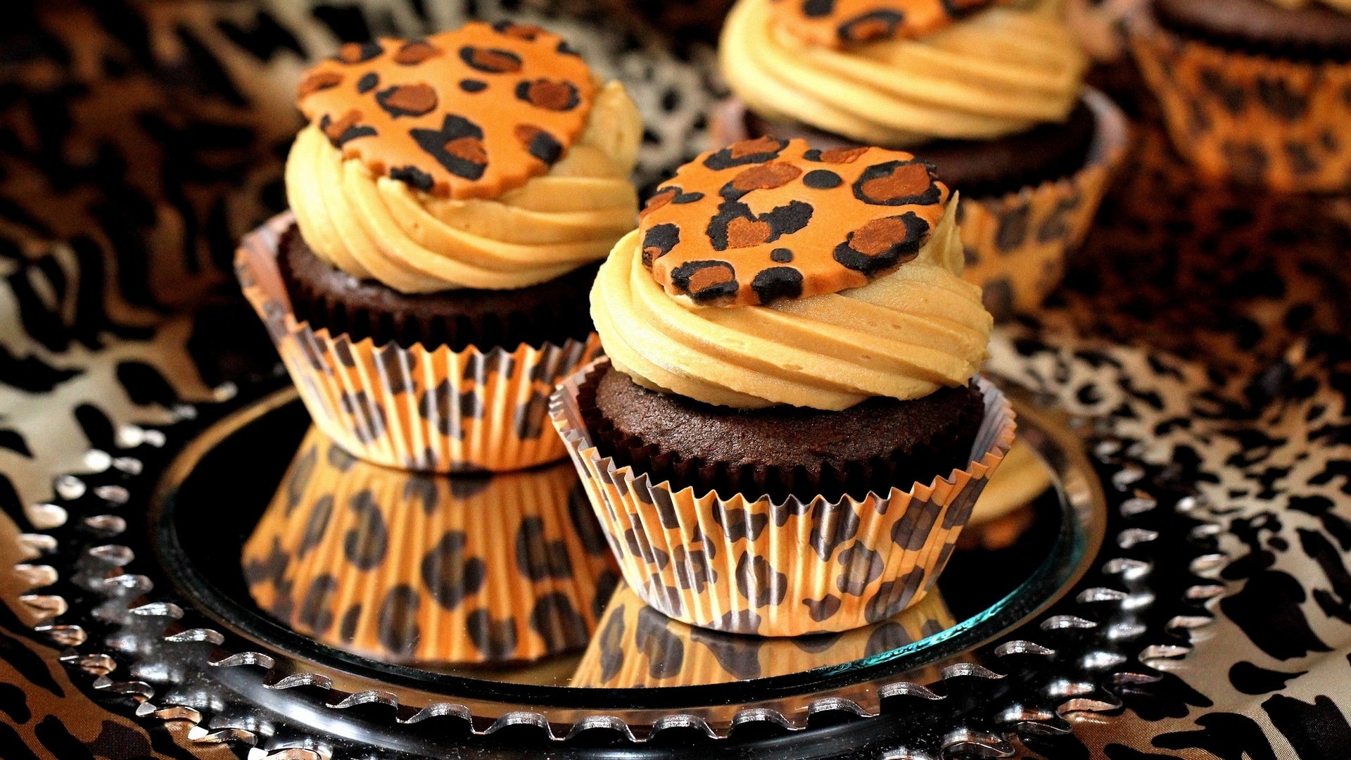 Description: A plate of cupcakes with frosting and leopard print decorations on them on a table cloth with a black and white pattern.