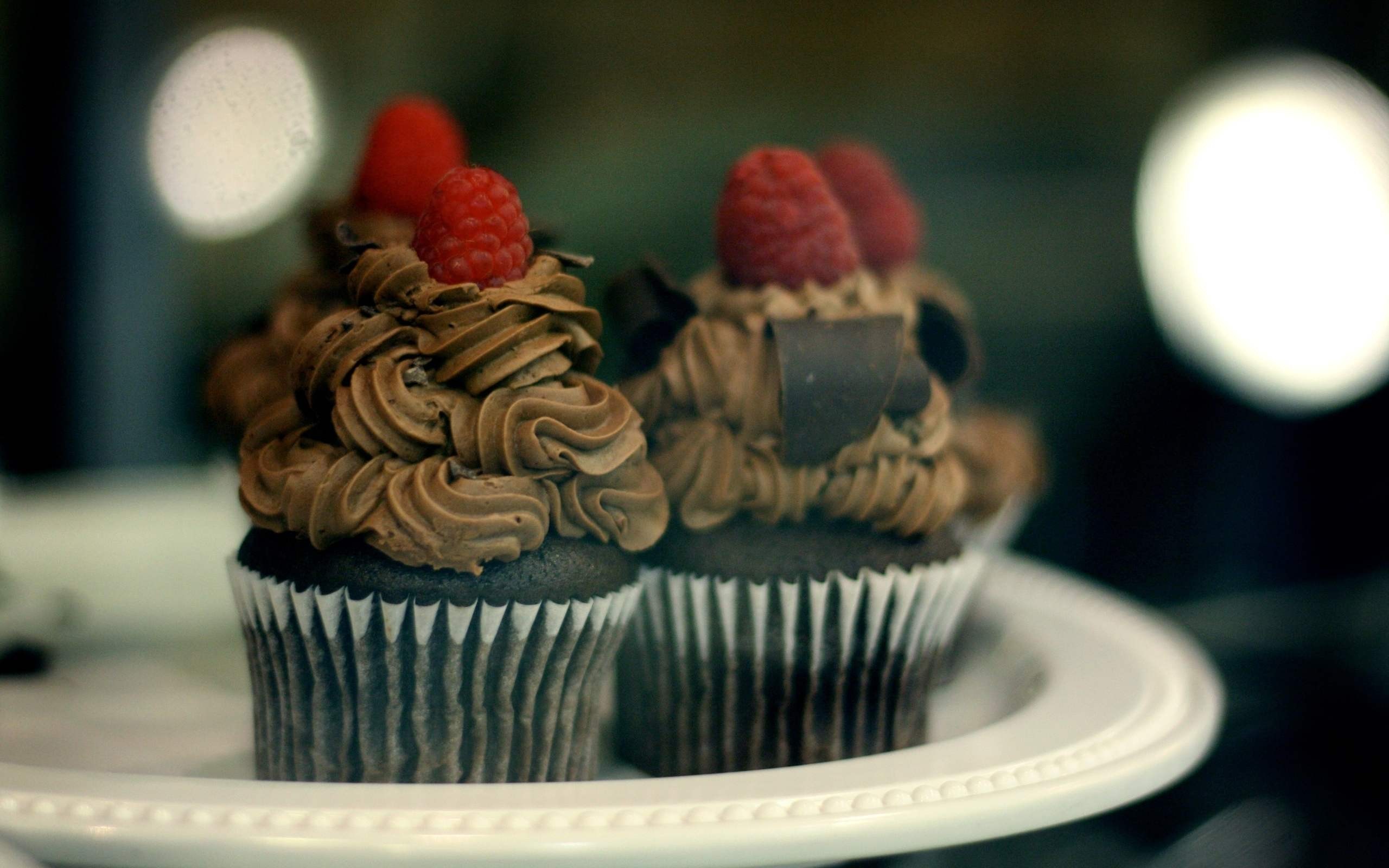 Description: A couple of cupcakes that are on a plate with some raspberries on top of them.