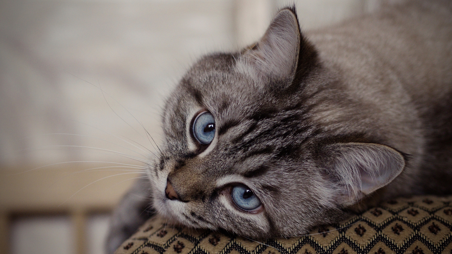 Description: A cat with blue eyes laying on a chair cushion looking up at the camera with a curious look on its face.