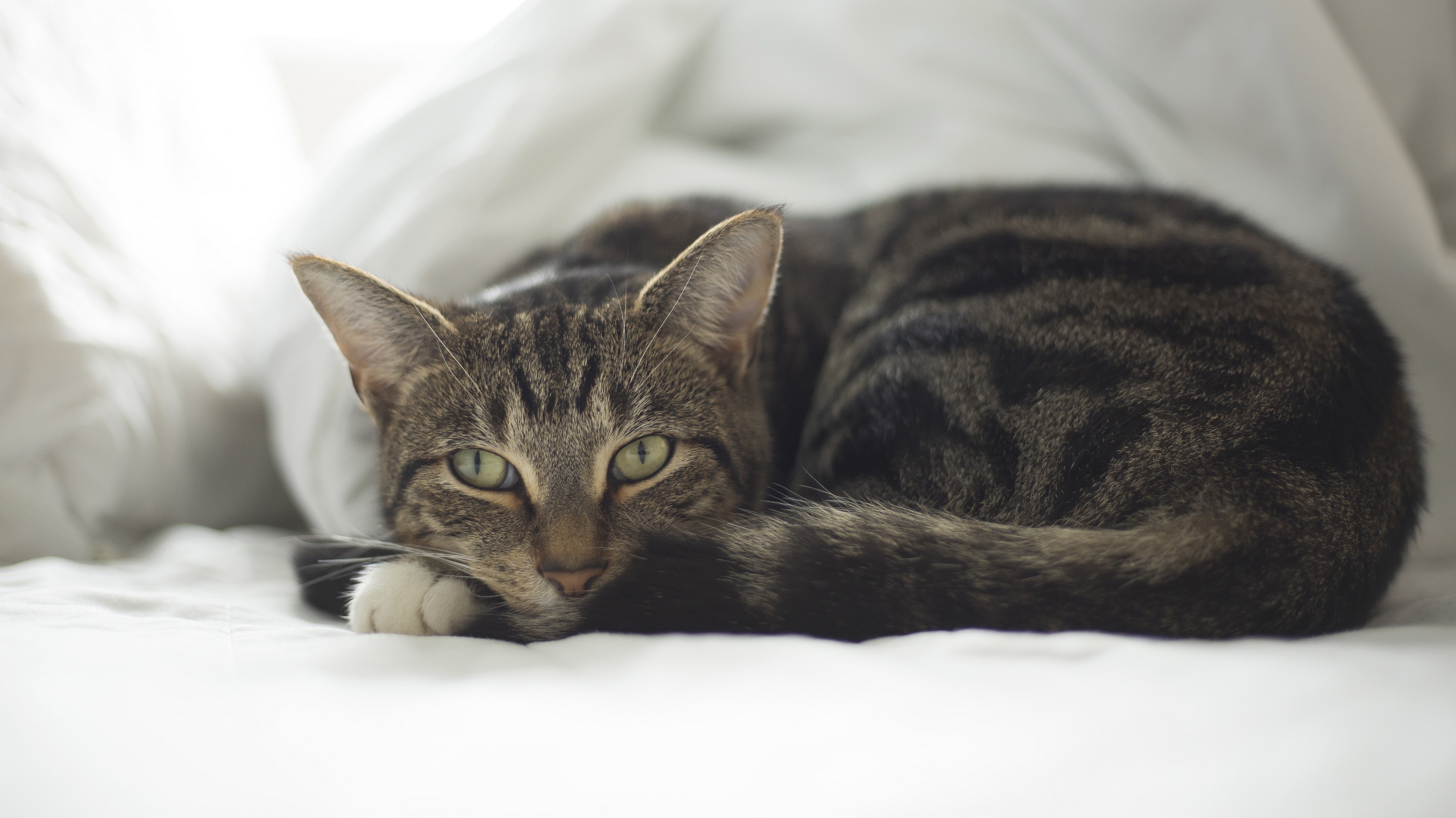 Description: A cat laying on a bed with white sheets and pillows in the background.