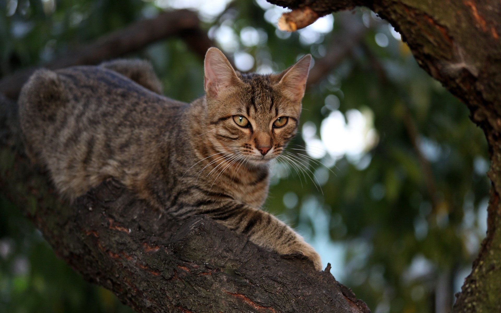 Description: A cat sitting on a tree branch looking at the camera with a curious look on its face and eyes.