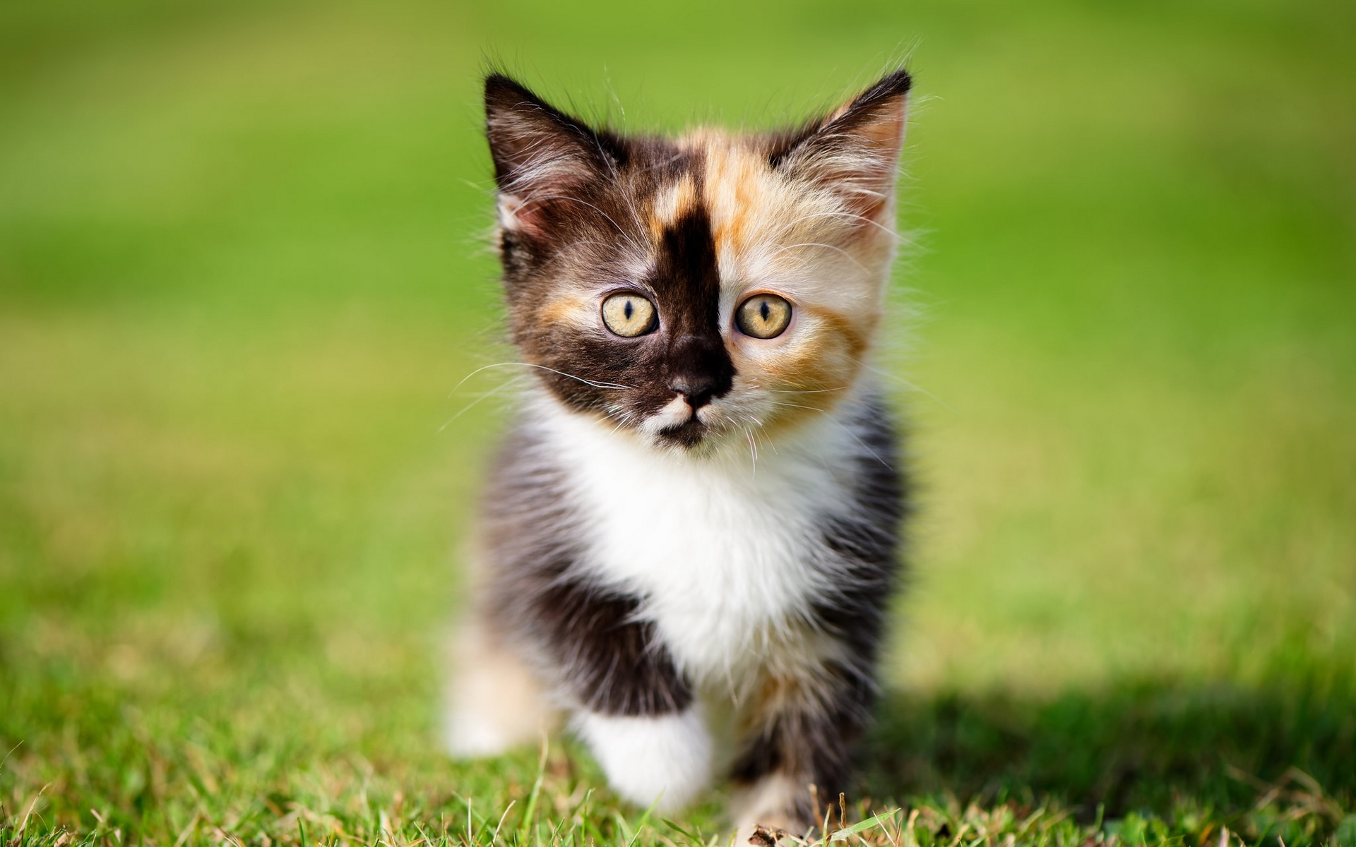 Description: A small kitten walking across a lush green field of grass with a curious look on its face and eyes.