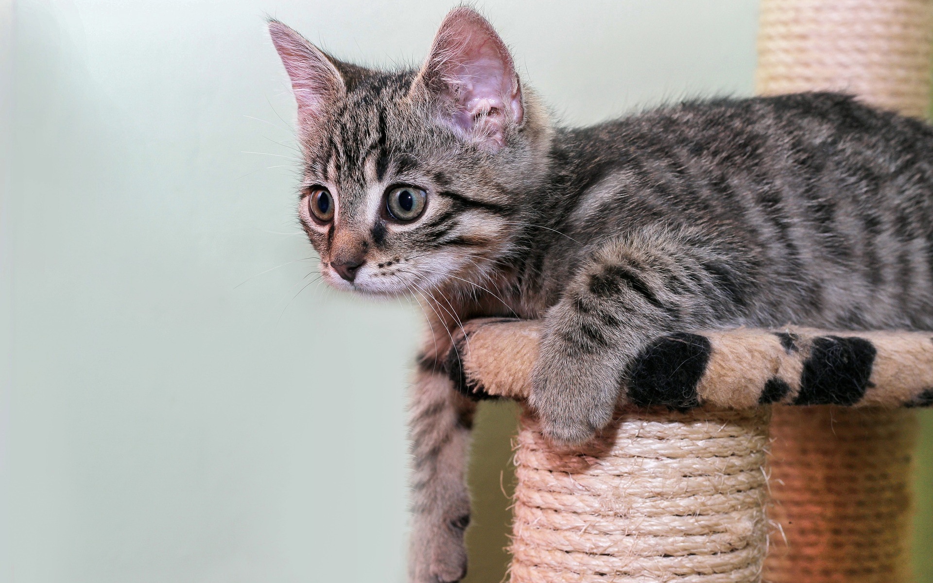 Description: A small kitten is sitting on a scratching post and looking at the camera with a curious look on its face.