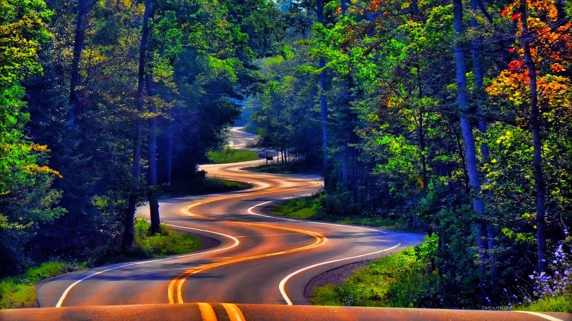 Description: A road with a curve in the middle of it surrounded by trees and bushes with a yellow light on the road.