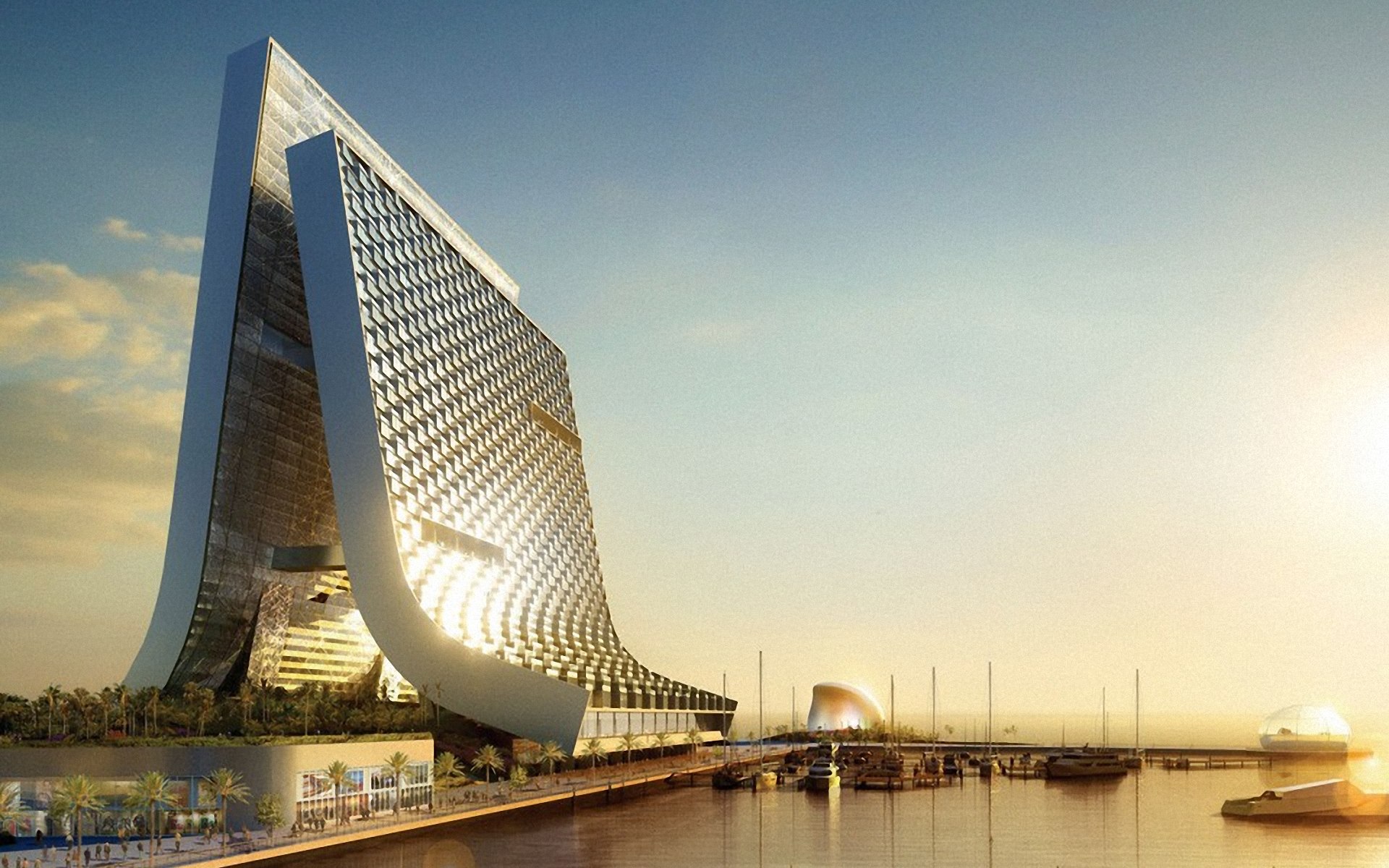 Description: A large building with a curved roof next to a body of water with boats in it and a bridge in the background.