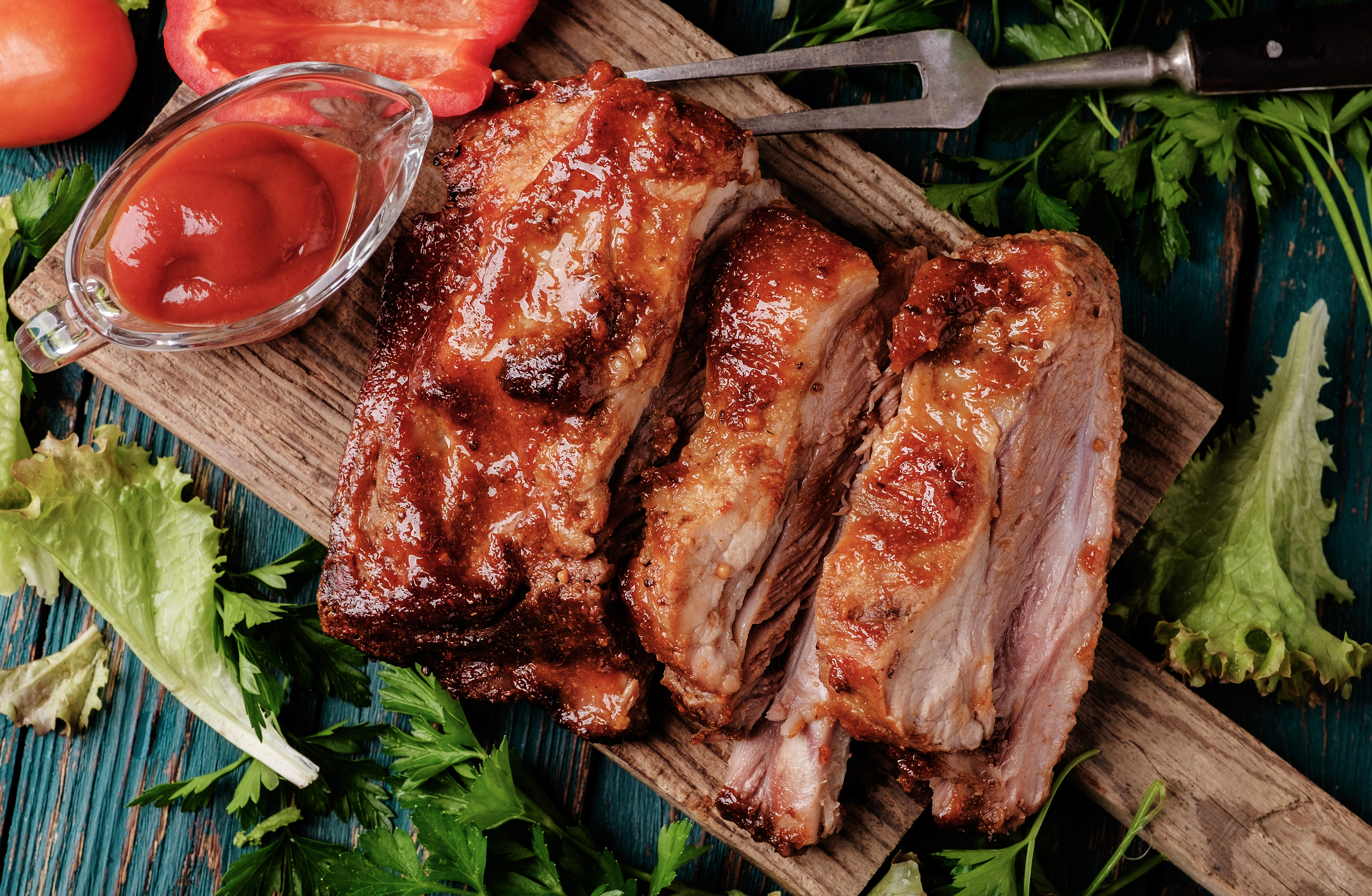 Description: A cutting board with meat and vegetables on it and a knife and sauce on the side of the board.