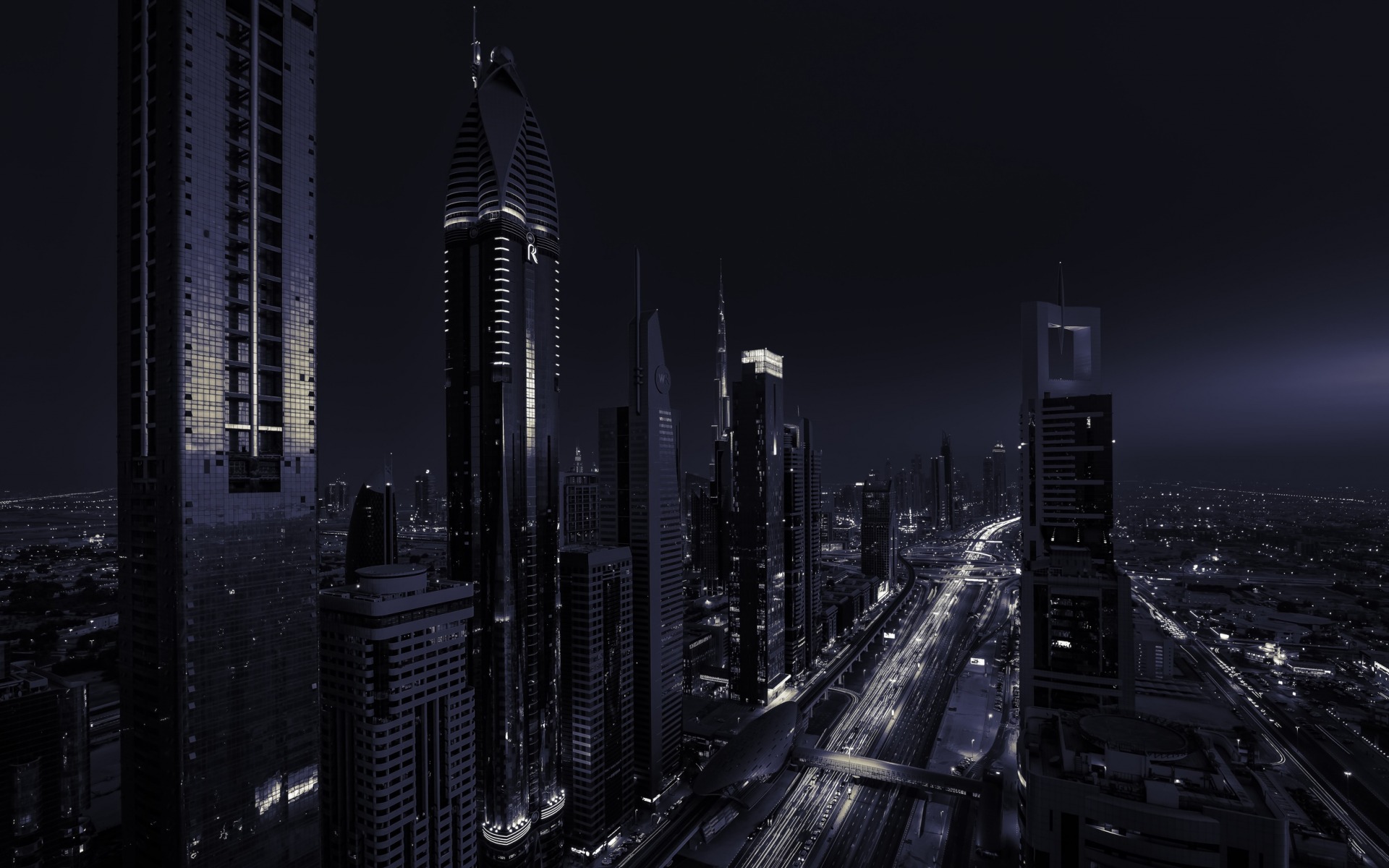 Description: A city at night with a lot of tall buildings and a street light in the middle of the city.