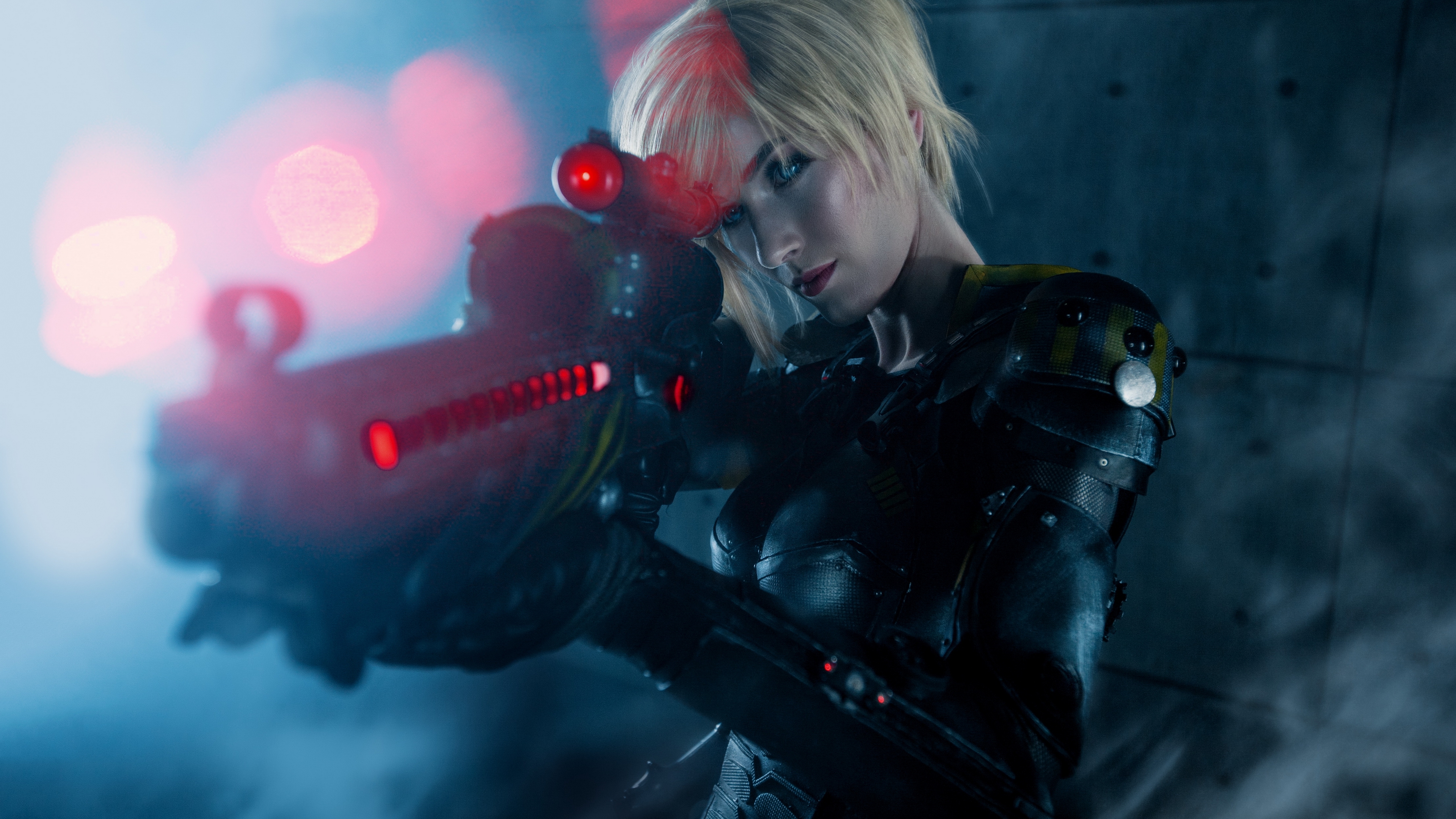 Description: A woman holding a gun in a dark room with red lights on it's sides and a gun in her hand.