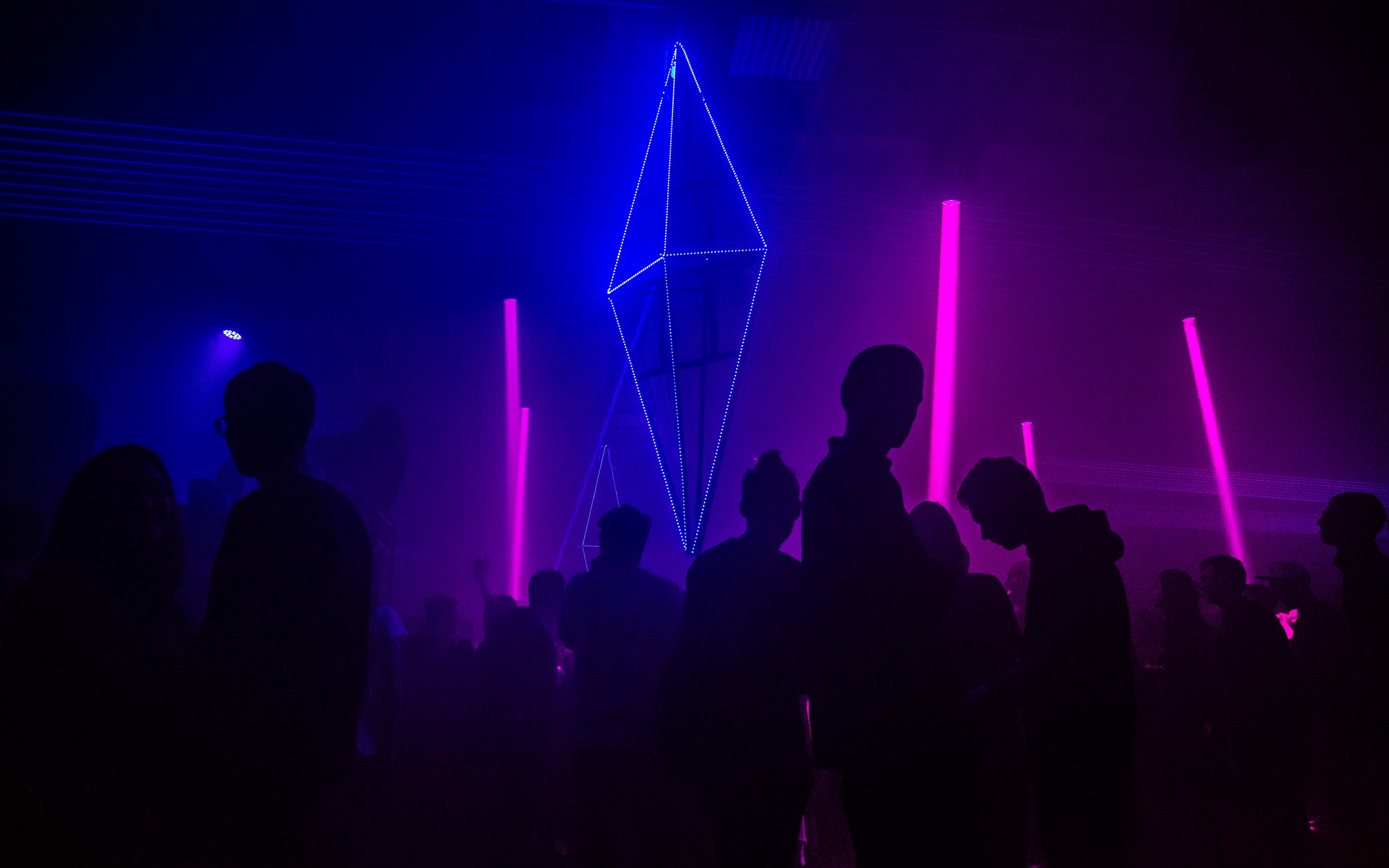 Description: A group of people standing around a room with purple and blue lights on it's walls and a pyramid shaped object in the middle of the room.