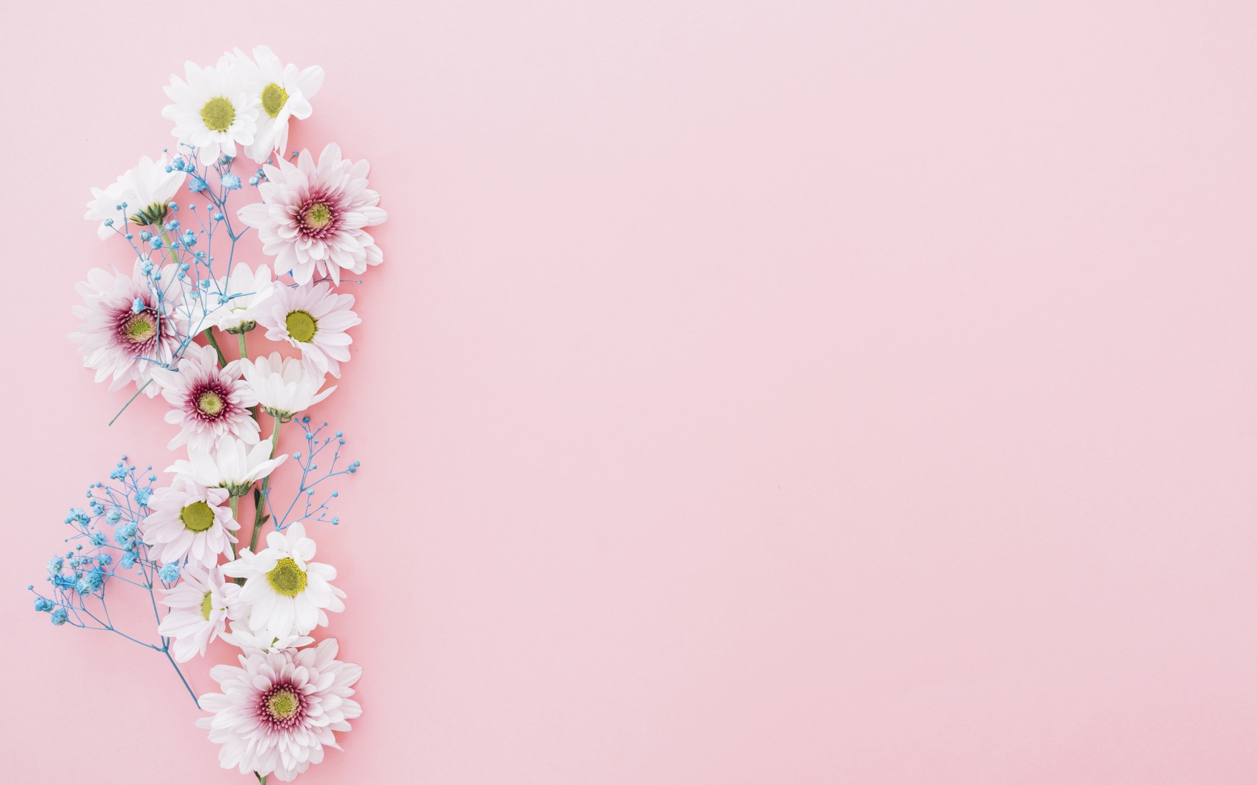 Description: A bunch of daisies and other flowers on a pink background with copy space for text or image or image.
