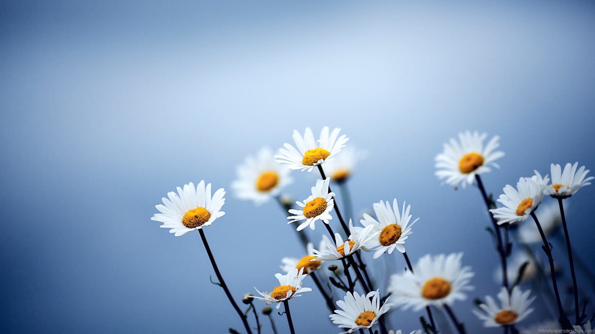 Description: A bunch of daisies are in a vase on a table top with a blue background and a sky in the background.