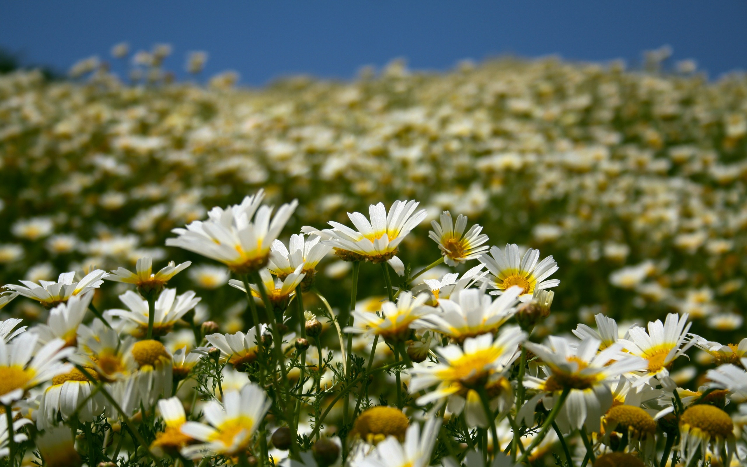 Description: A field of daisies with a blue sky in the background and a few yellow flowers in the foreground.