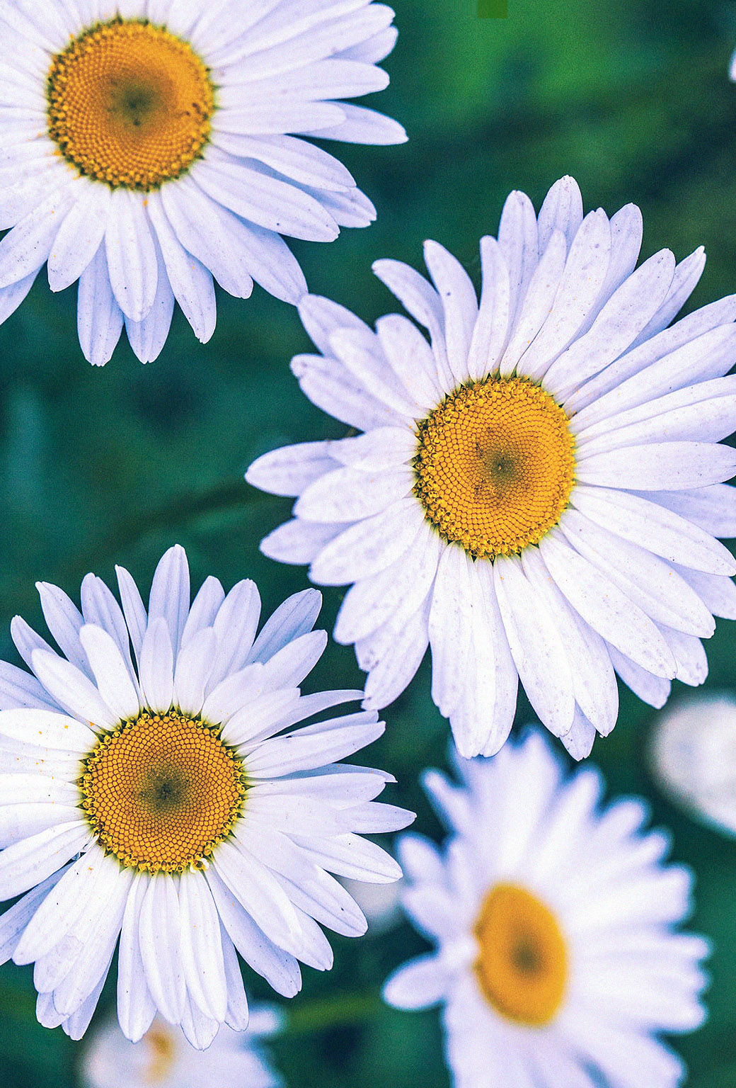 Description: A group of white daisies with yellow centers in a field of grass with a green background and a blurry background.