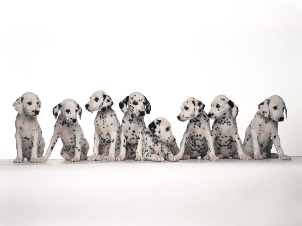 Description: A group of dalmatian puppies sitting in a row on a white surface with a white background.