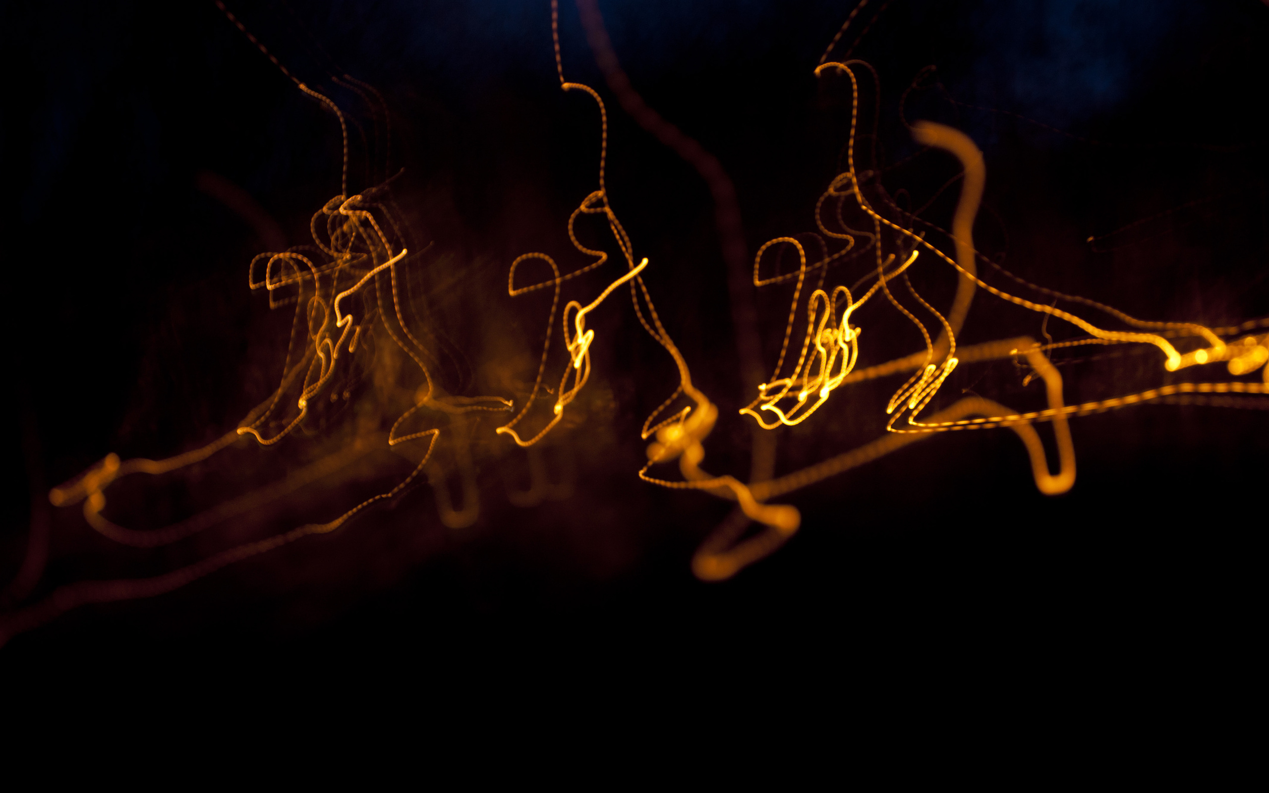 Description: A group of people are dancing in the dark with lights on them and a black background with a yellow light.