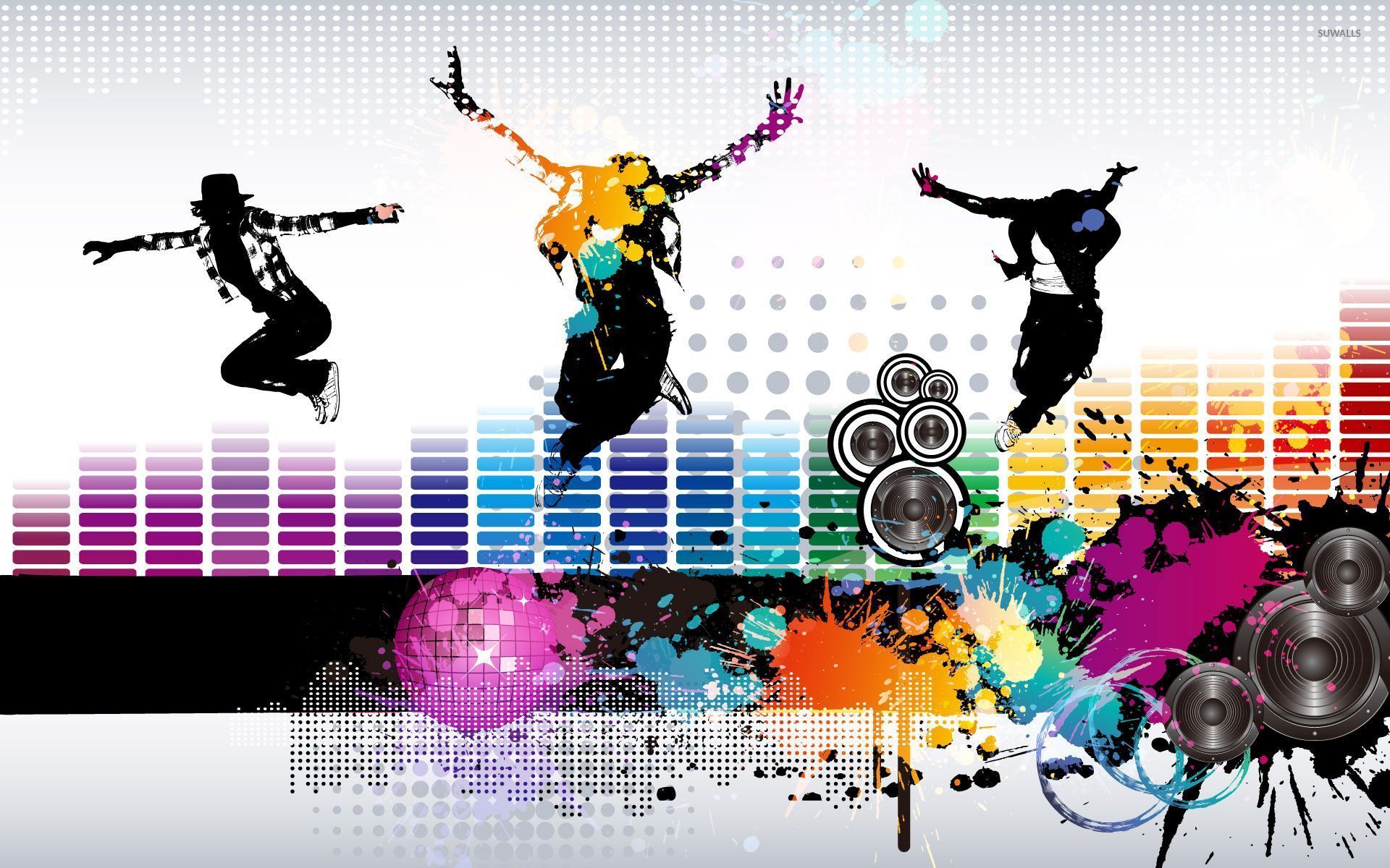 Description: A group of people dancing in front of a colorful background with a speaker and speakers on it.