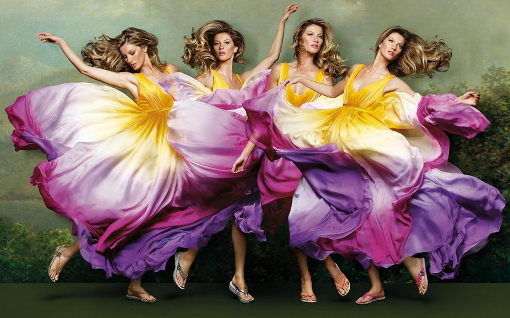 Description: Three women in dresses are dancing in the air with their arms in the air and their legs in the air.