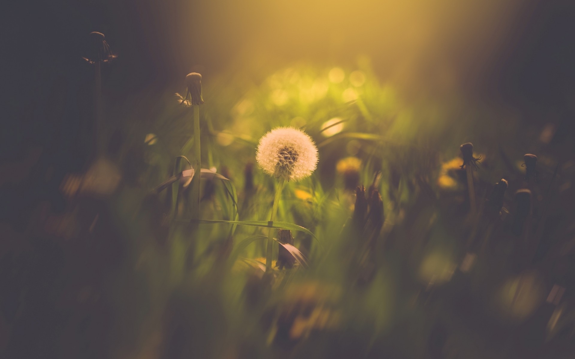 Description: A dandelion in a field of grass with the sun shining through the grass and the grass is green.