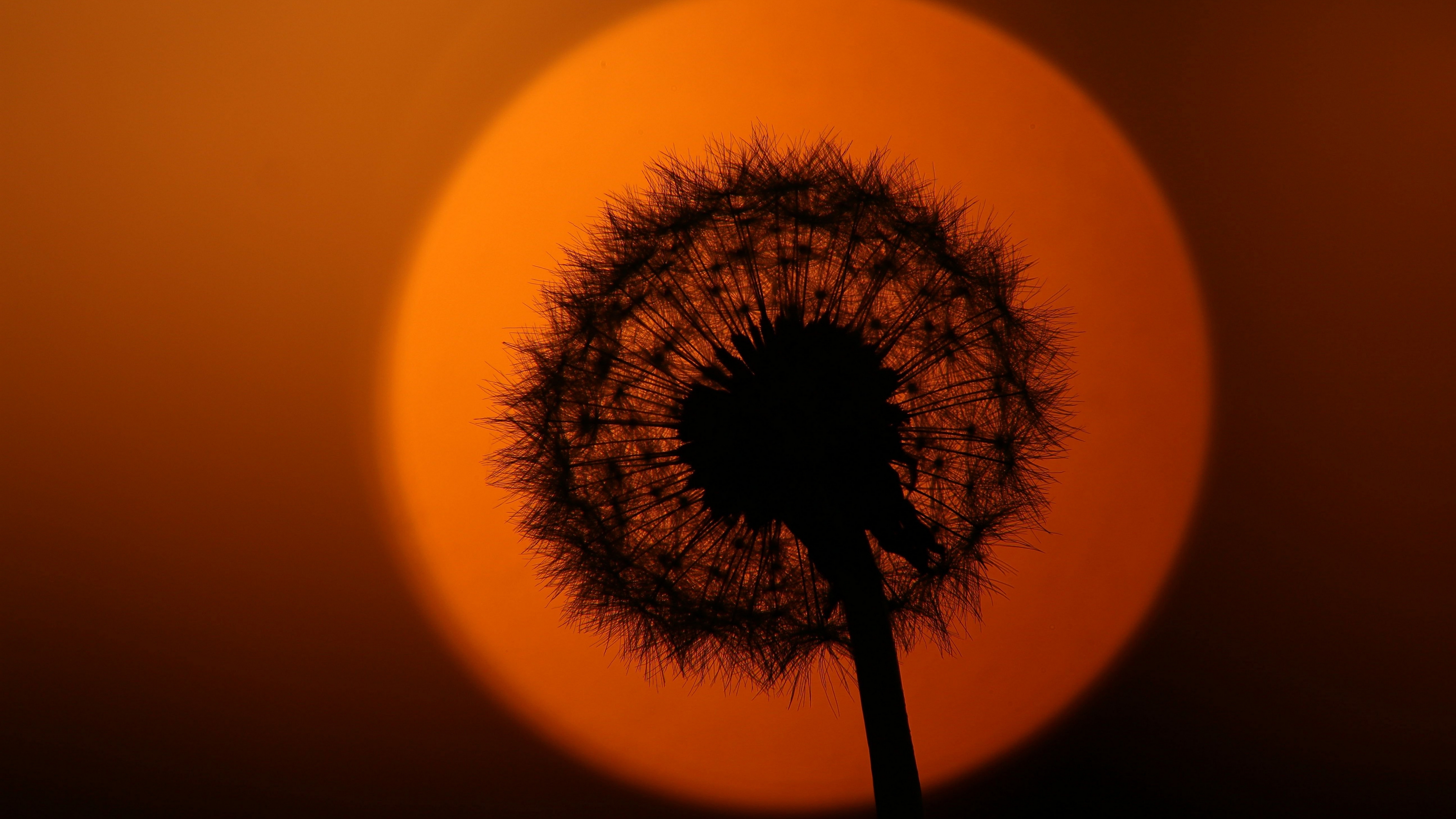 Description: A dandelion in the middle of a sunset with a bright orange sky in the background and a silhouette of a tree.