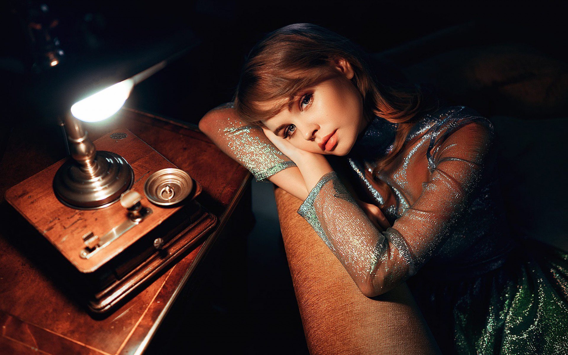 Description: A woman sitting at a table with a lamp on it's side and her hand on her face.