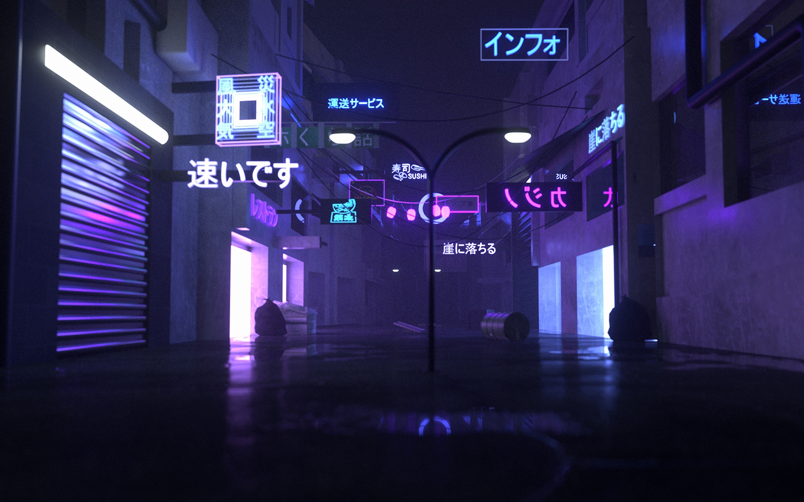 Description: A dark alley with neon signs and a person walking down the street at night in the rain.