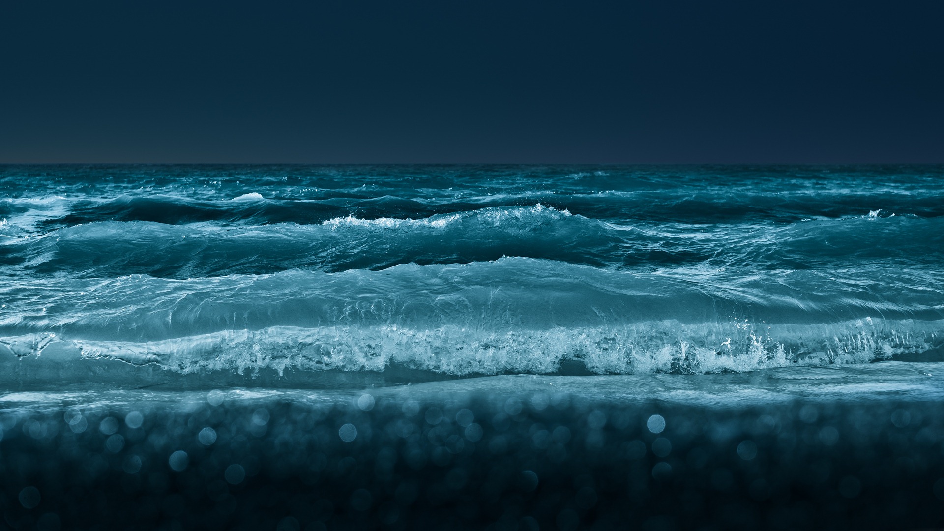 Description: A dark blue ocean with waves crashing on the shore and a dark sky in the background with a few clouds.