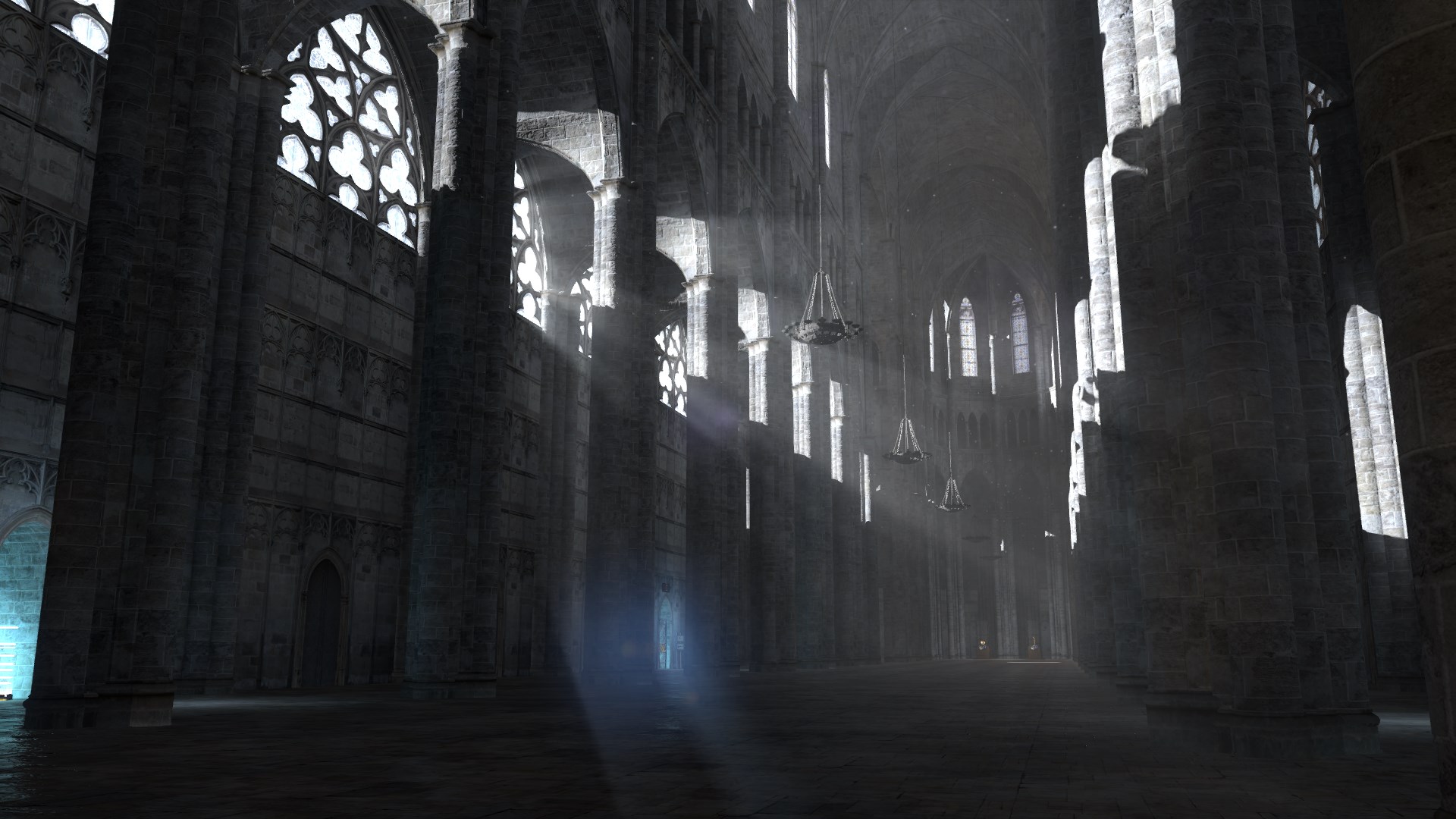 Description: A dark cathedral with a light shining through the windows and a person standing in the middle of the room.