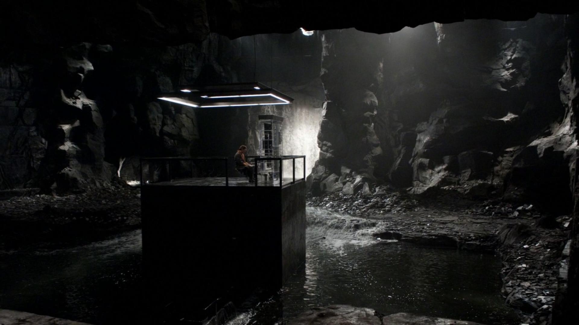 Description: A dark cave with a light shining in the dark and a person standing on a platform in the middle of the cave.