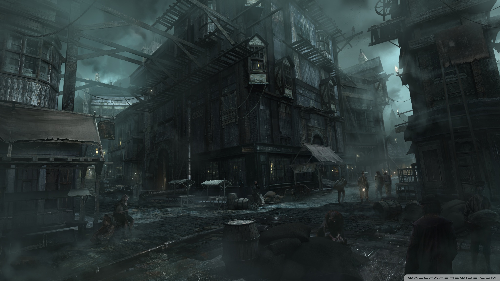 Description: A dark city with lots of people walking around it and a building with a clock on it's side.