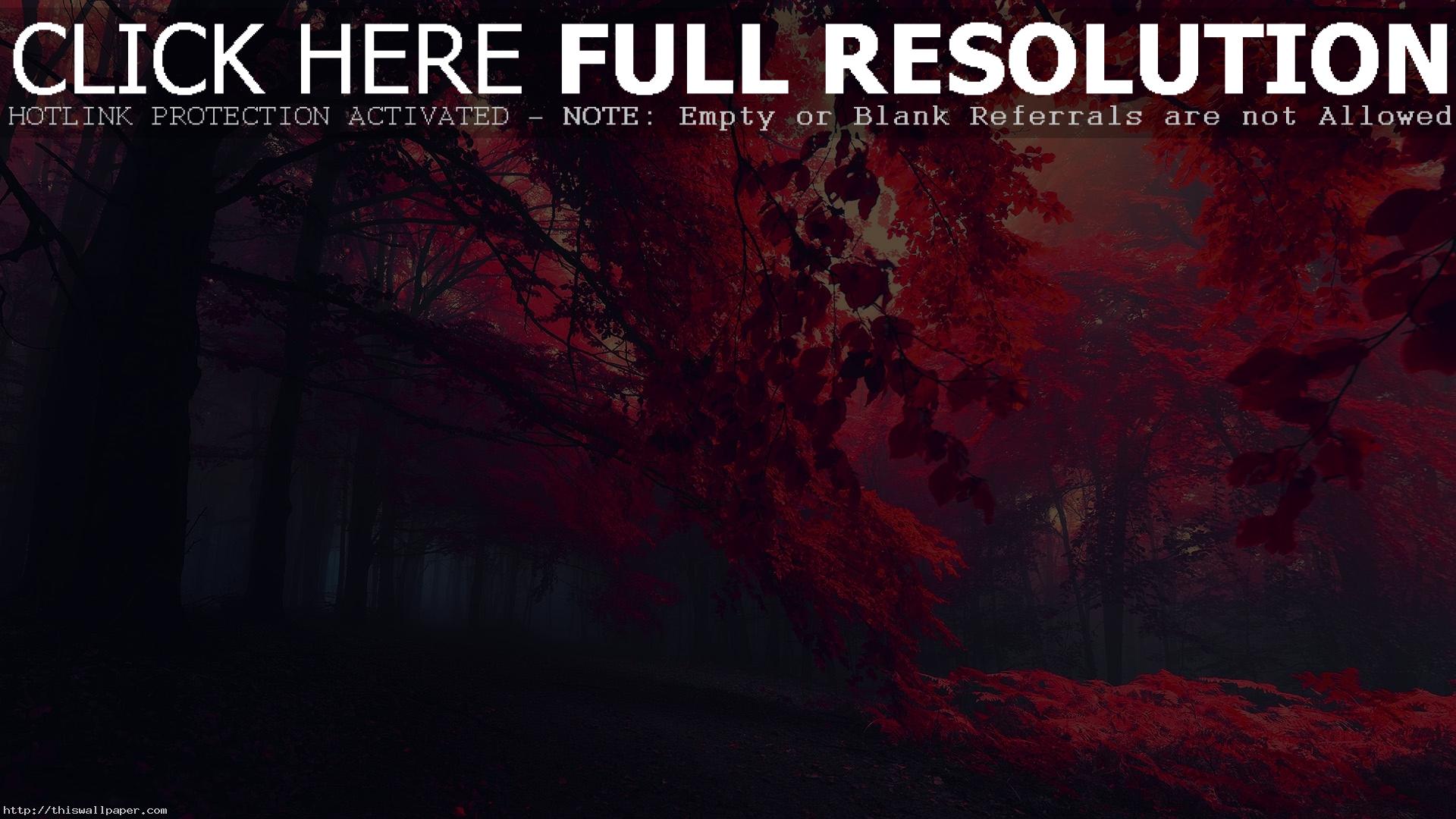 Description: A dark forest with red leaves and a red light coming from the trees and the words.