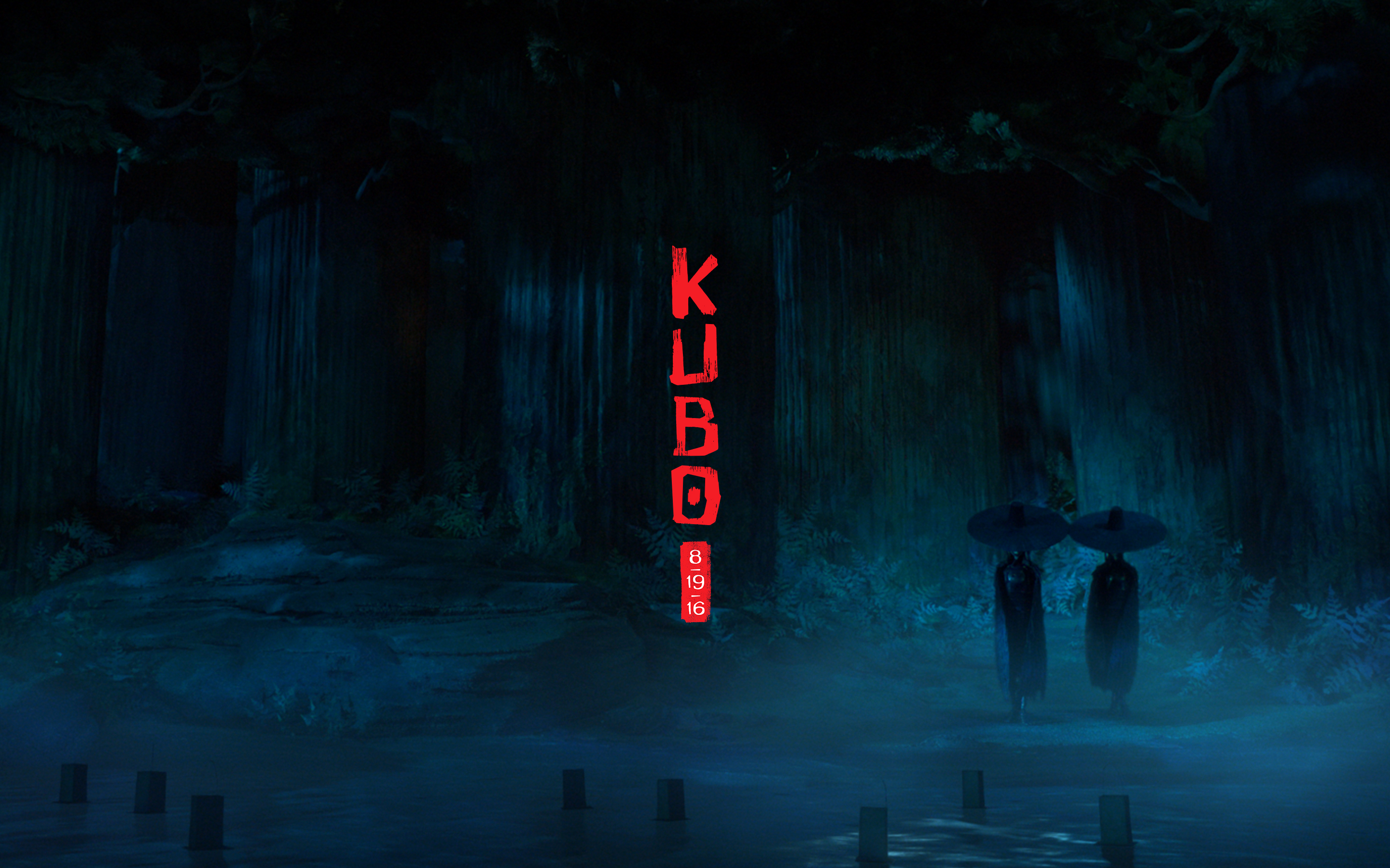 Description: Two people standing in a dark forest holding umbrellas in front of a red sign that reads kubo.