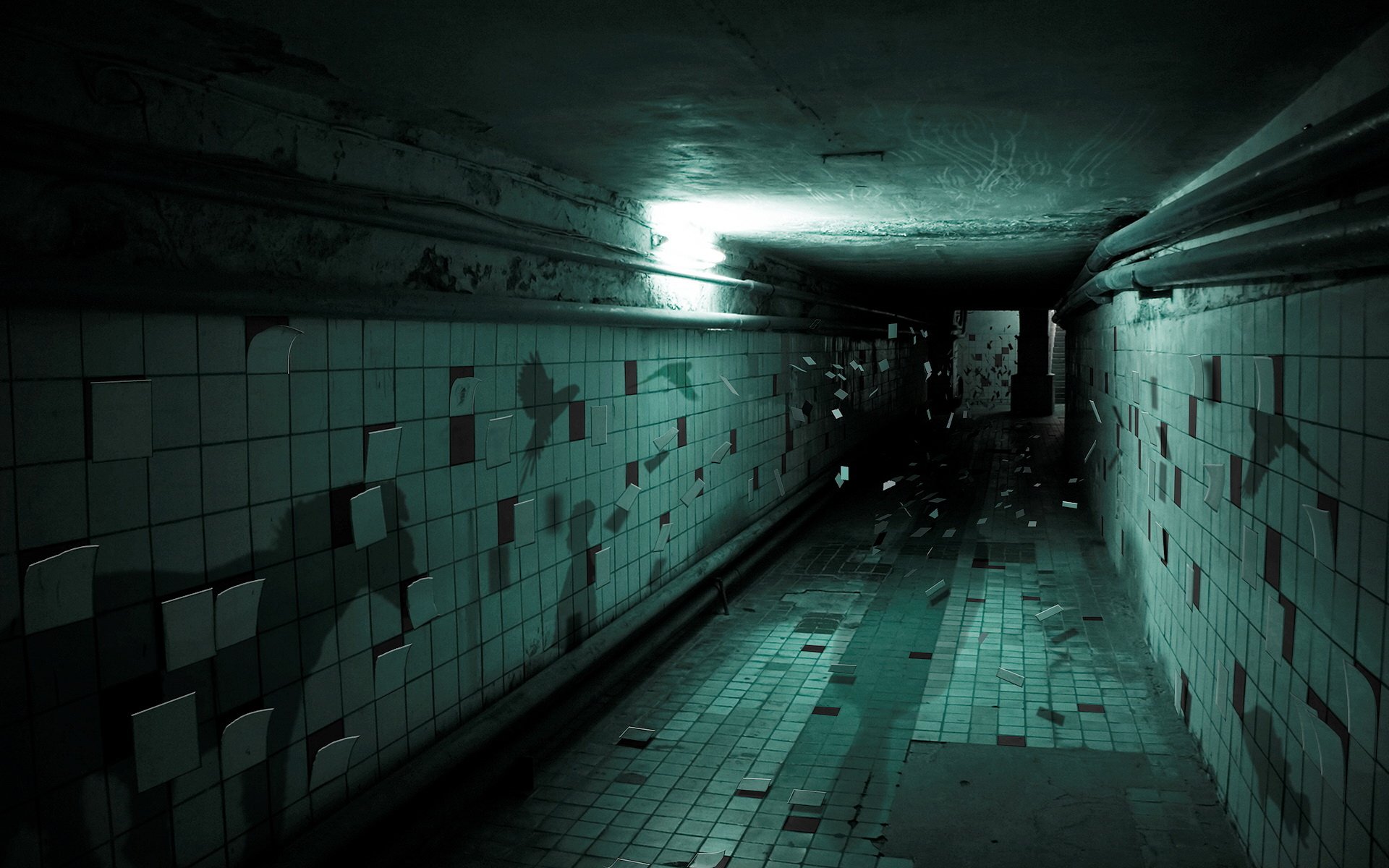 Description: A dark hallway with tile floors and walls and a light at the end of the tunnel that is lit.