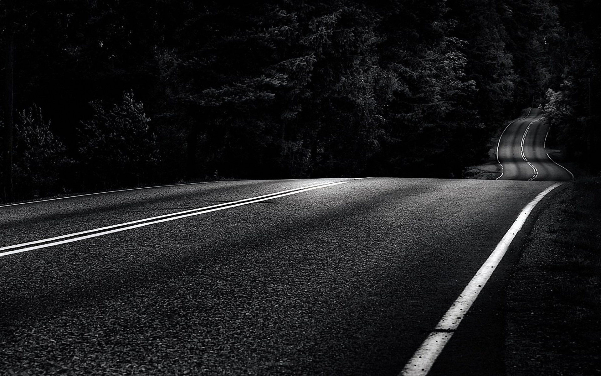 Description: A black and white photo of a road in the dark with trees in the background and a light at the end of the road.