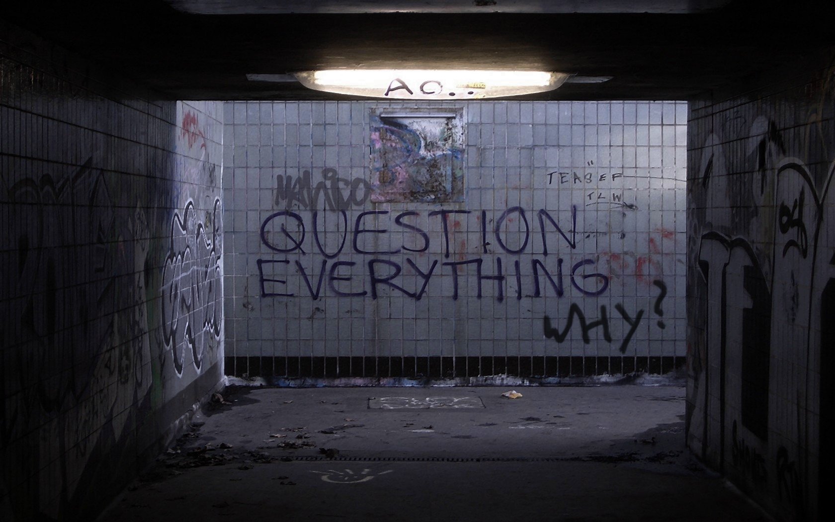 Description: A dark room with graffiti on the walls and a light above it that says question everything my life is.